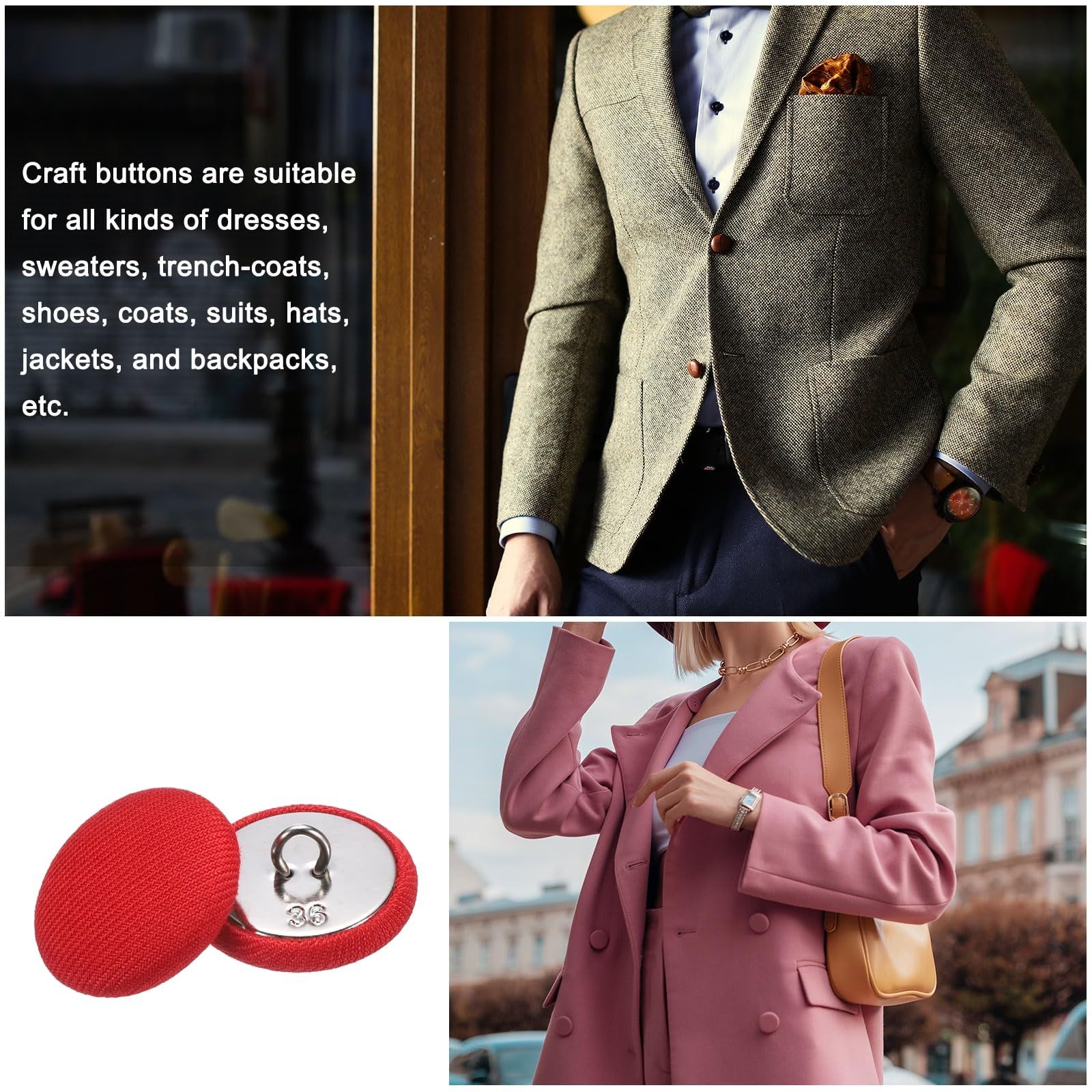 クラフトボタンは、ドレス、セーター、トレンチコート、靴、コート、スーツ、帽子、ジャケット、バックパックなど、あらゆる種類の衣類に適しています。