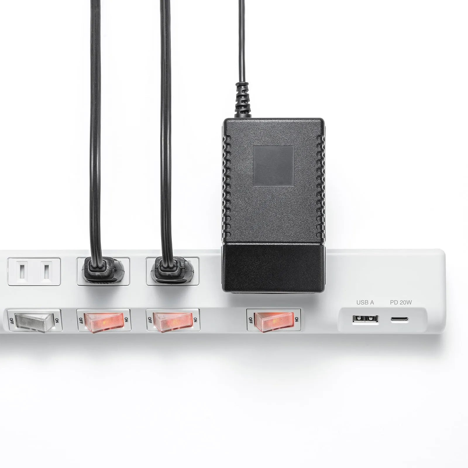 ●AC差込口は6個口で押しやすい角度に個別スイッチと一括でONとOFFが可能な集中スイッチが付いた節電対策になるタップ。