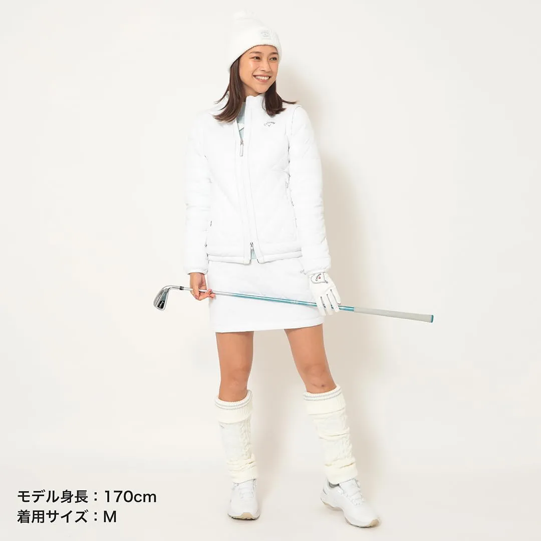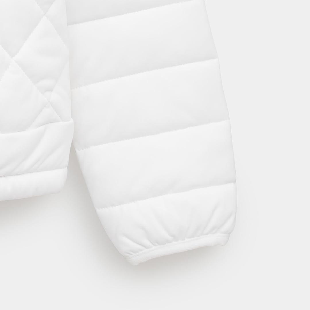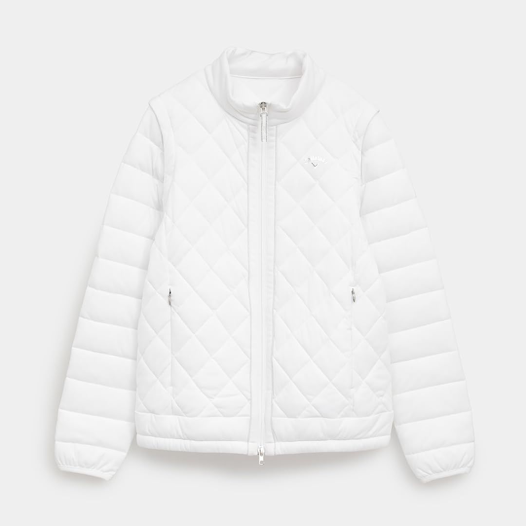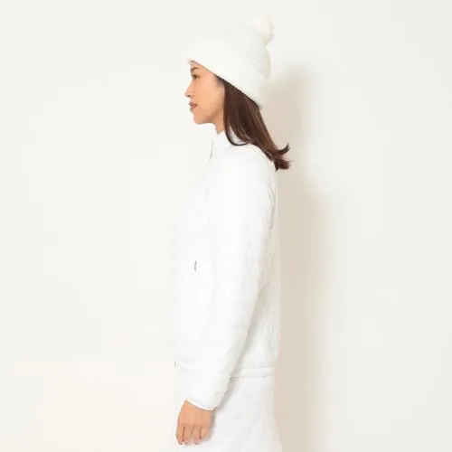 高機能素材「スターストレッチeco」を使った中綿アウターです。嵩高性の高い中綿を使用しているので保温力が強く、寒い冬でも活躍。寒暖差を考慮して、袖デタッチャブルの仕様にしました。フロ ントのラメパイピングとスライダーのリボンテープ、胸元のシルバープリントロゴが統一感あるデザインポイントです。