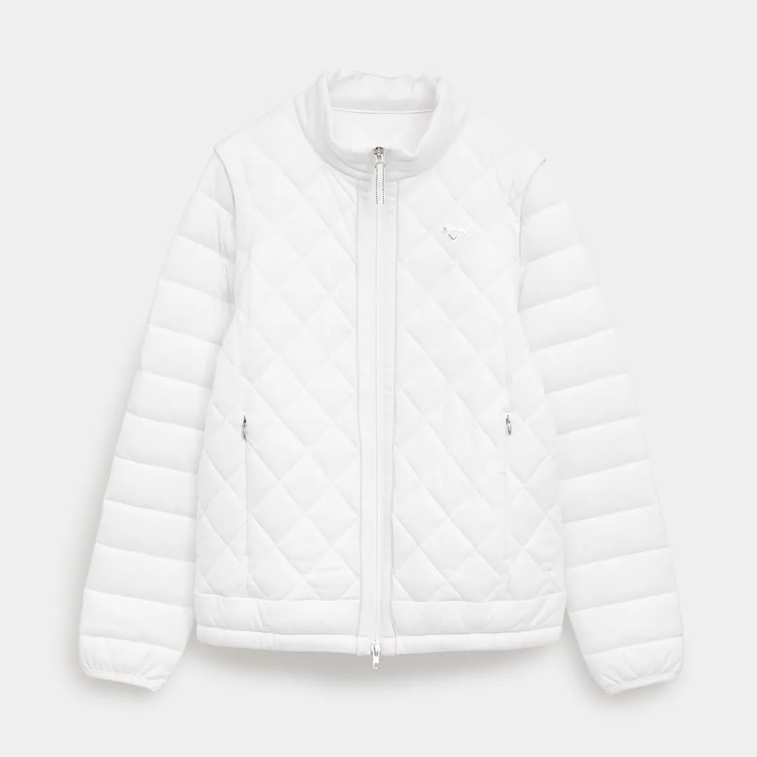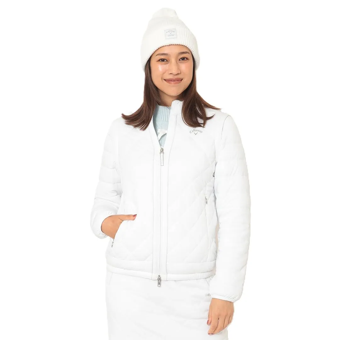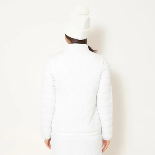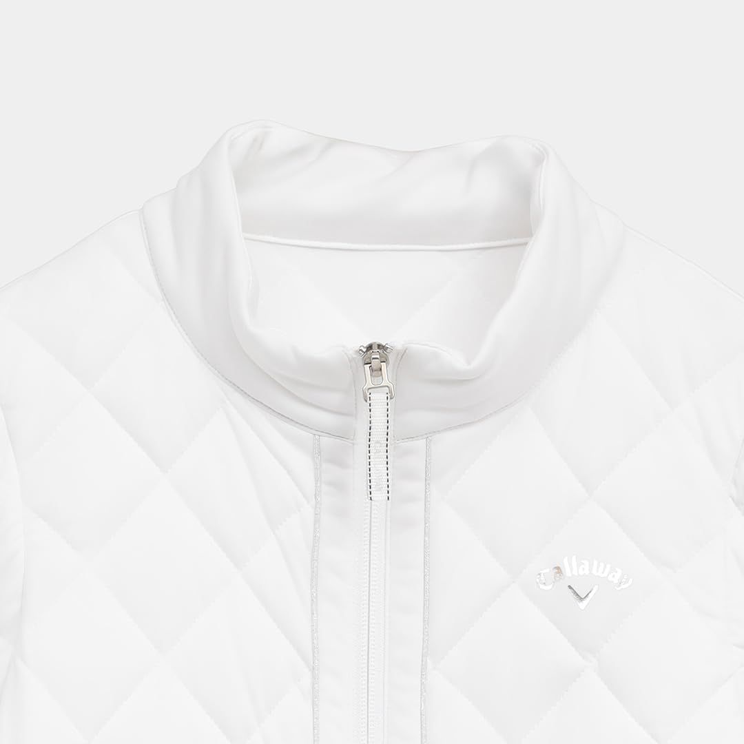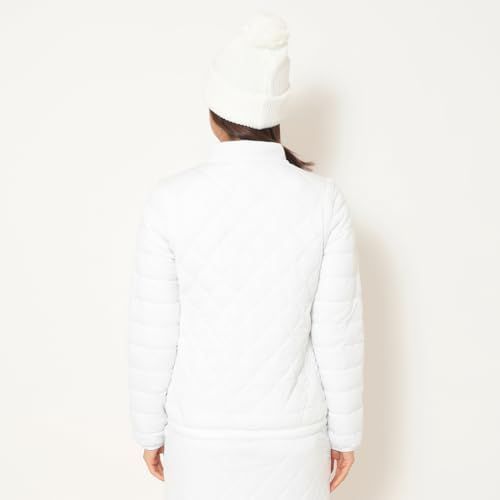 高機能素材「スターストレッチeco」を使った中綿アウターです。嵩高性の高い中綿を使用しているので保温力が強く、寒い冬でも活躍。寒暖差を考慮して、袖デタッチャブルの仕様にしました。フロ ントのラメパイピングとスライダーのリボンテープ、胸元のシルバープリントロゴが統一感あるデザインポイントです。