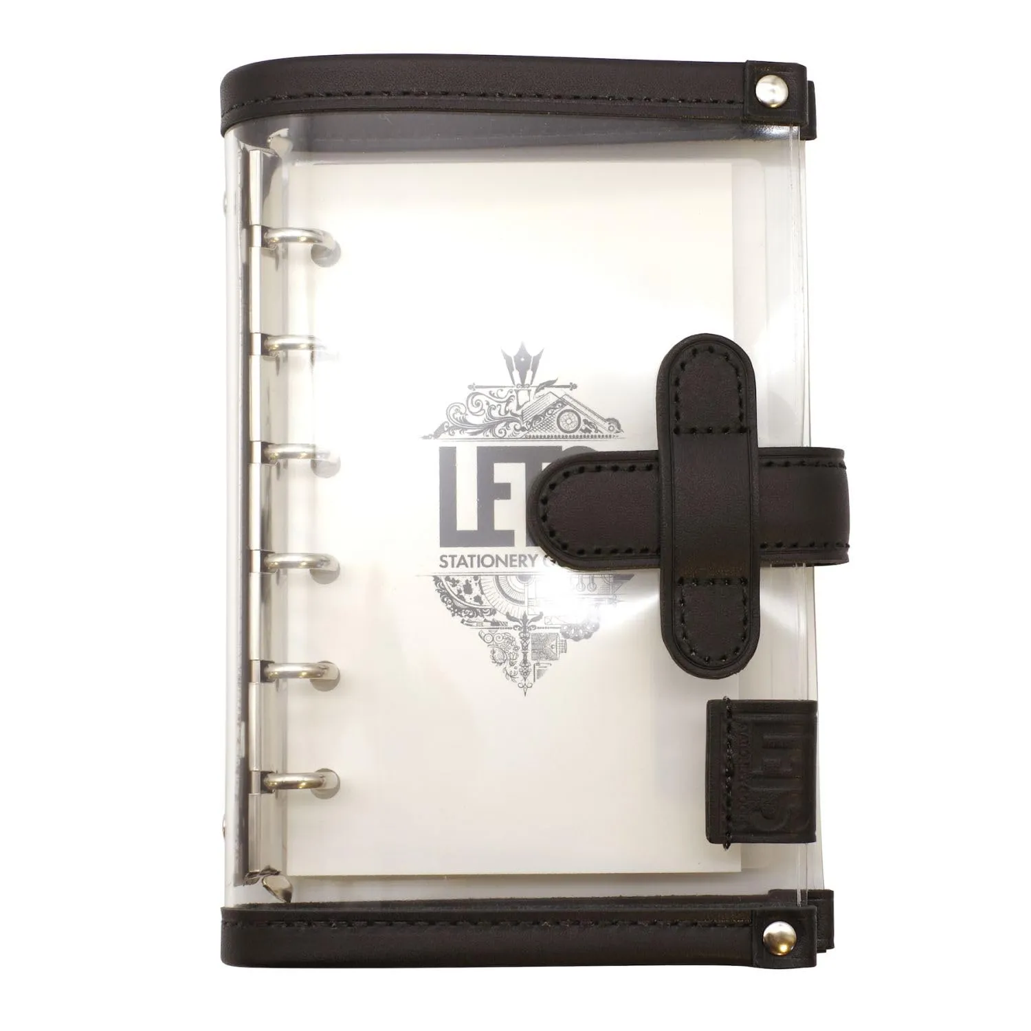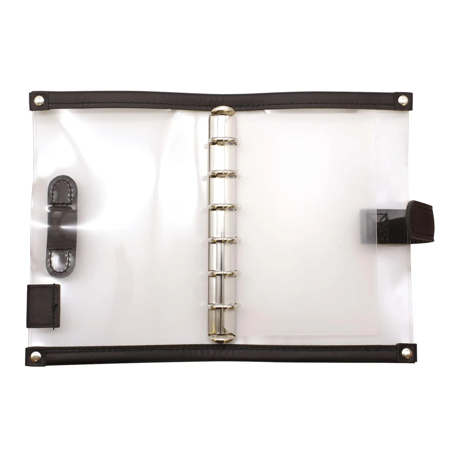 透明素材(PVCビニール)× 国産本革を組み合わせた透明感のあるLETSクリアシステム手帳です。透明のPVCビニール素材は片面非転写1.5mm厚。内側に非転写加工がされているため、ビニールに色移りや転写を防止し、コピー用紙や写真を挟んでも問題なくお使いいただけます。