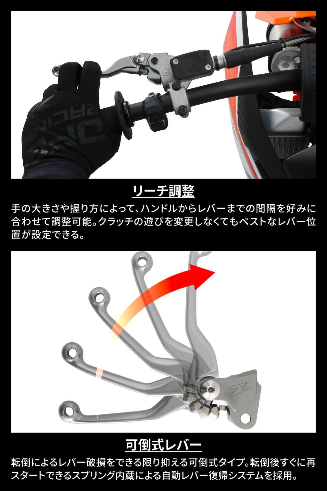 クラッチレバー長150mm:ブレーキレバー長124mm(取付け軸からレバーエンドまでの距離)レバーアームは指3本まで掛けられるショートタイプを標準装備。オプションパーツに指4本までのロングタイプをラインナップ。