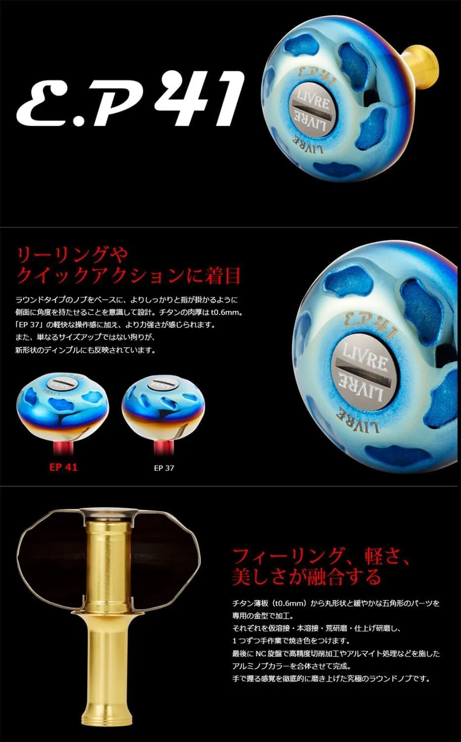 2本の指を最大限に生かす理想の形状と操作感を持つラウンドタイプ形状の薄肉中空チタンノブ「EP37」をベースに、より力強さを感じられる新形状のディンプルを採用したサイズアップモデル。