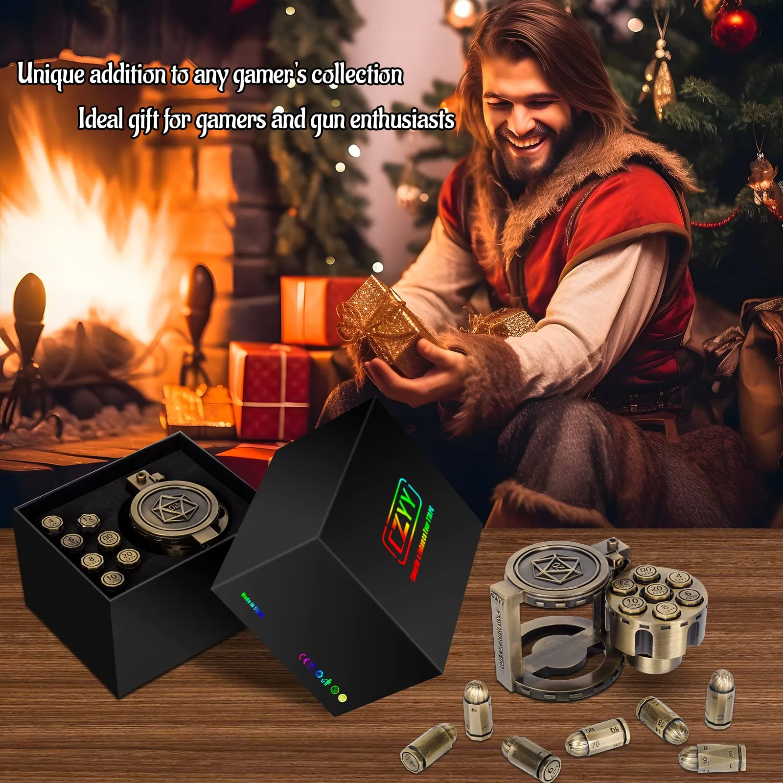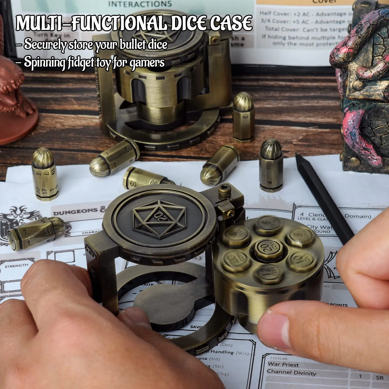 スピニングリボルバーシリンダーダイス容器 - 回転するリボルバーシリンダーダイスケースが付属します。クールなだけでなく、サイコロを保管するのにも実用的です。 このダイスボックスは、D&Dプレーヤーのフィジェットトイとしても機能し、ゲームプレイやバーチャルミーティングで落ち着いている間に手を忙しく保つのに最適です。