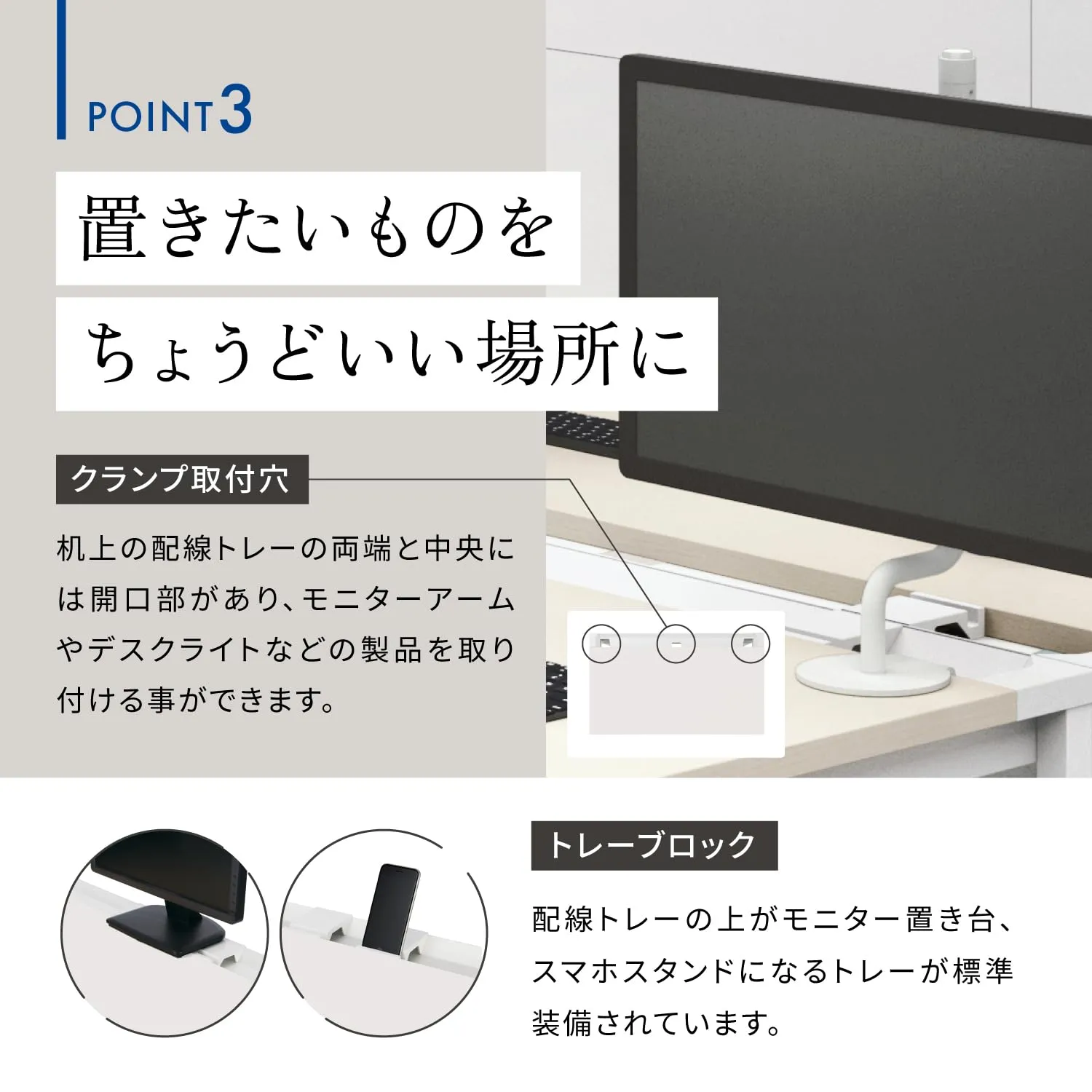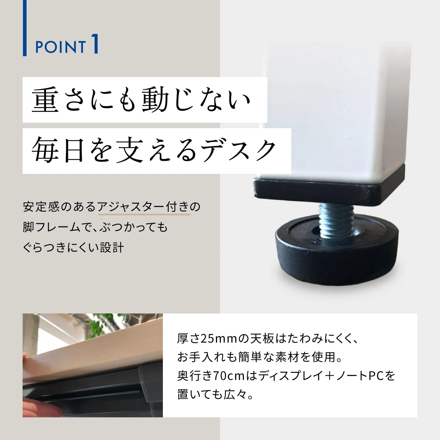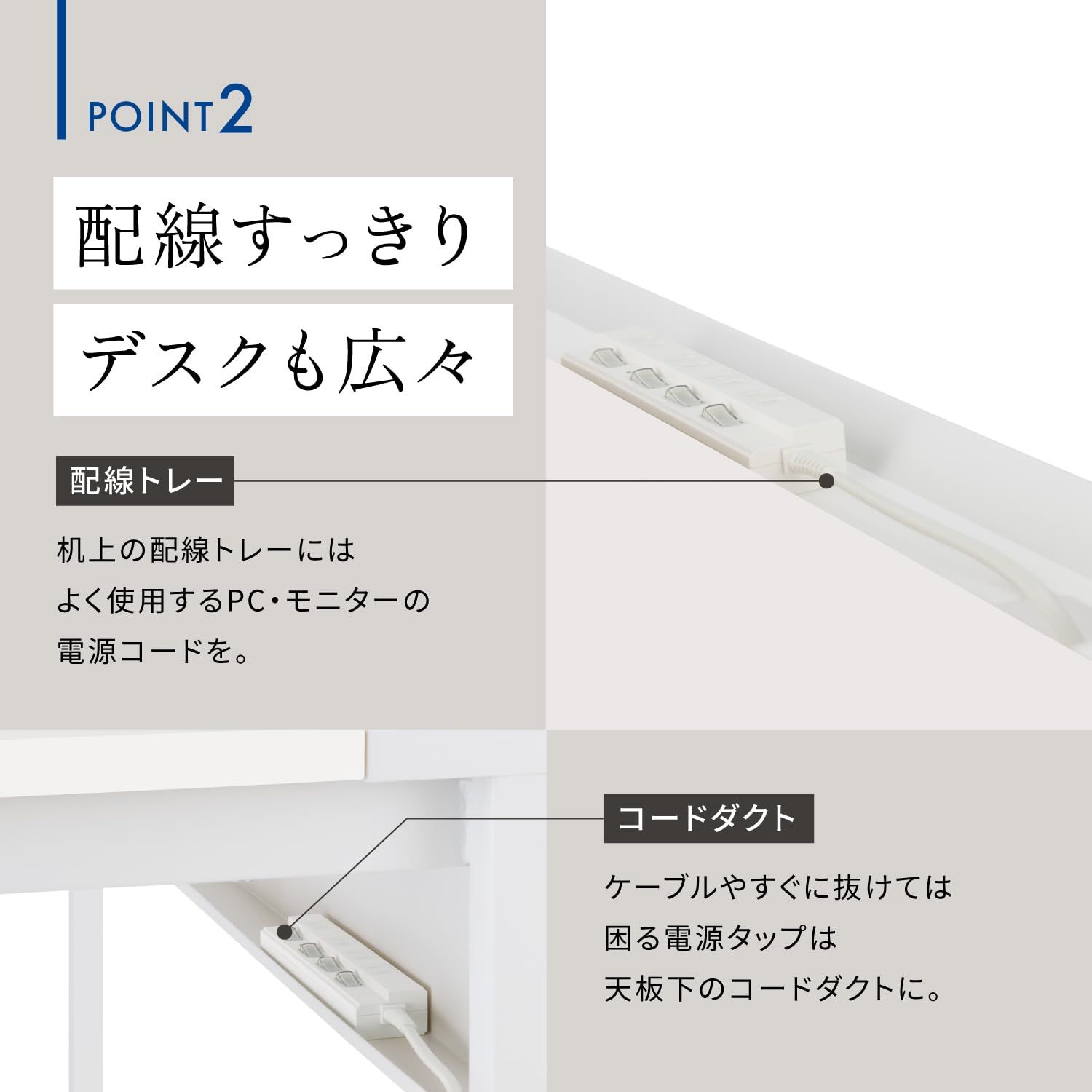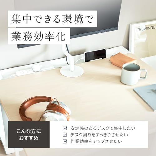 奥まで広々使える、カジュアルなシンプルデスク。机上面奥の配線トレーと天板下のコード受けで、ケーブル類をすっきりとまとめられます。