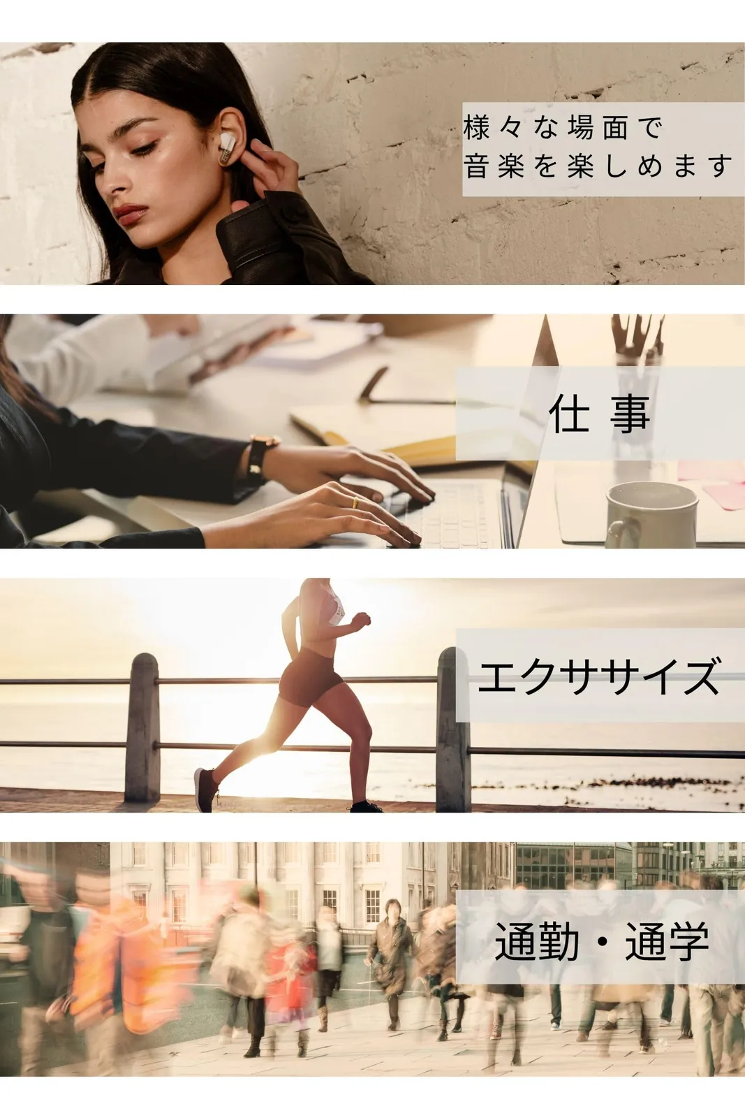 【静けさに溶ける、クリアな音】周りの雑音をすっと遮って、どこでも集中モードに。4サイズから選べるやわらかなシリコンイヤーチップと、耳にフィットするカナル型設計。最大30時間の再生で、ずっとクリアな音と一緒に。