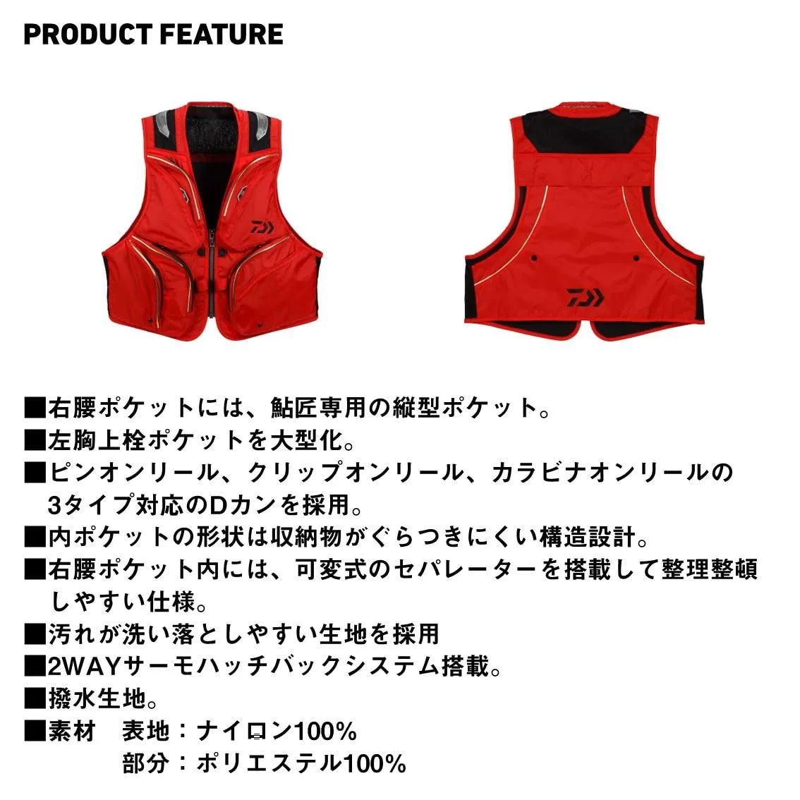 鮎/渓流などマルチに使える2WAYショートベスト 右腰ポケットには、鮎匠専用の縦型ポケットを新たに追加左胸上栓ポケットを大型化ピンオンリール、クリップオンリール、カラビナオンリールの3タイプ対応のDカンを採用。内ポケットの形状は収納物がぐらつきにくい構造設計。右腰ポケット内には、可変式のセパレーターを搭載して整理整頓しやすい仕様。汚れが洗い落としやすい生地を採用2WAYサーモハッチバックシステム搭載撥水生地