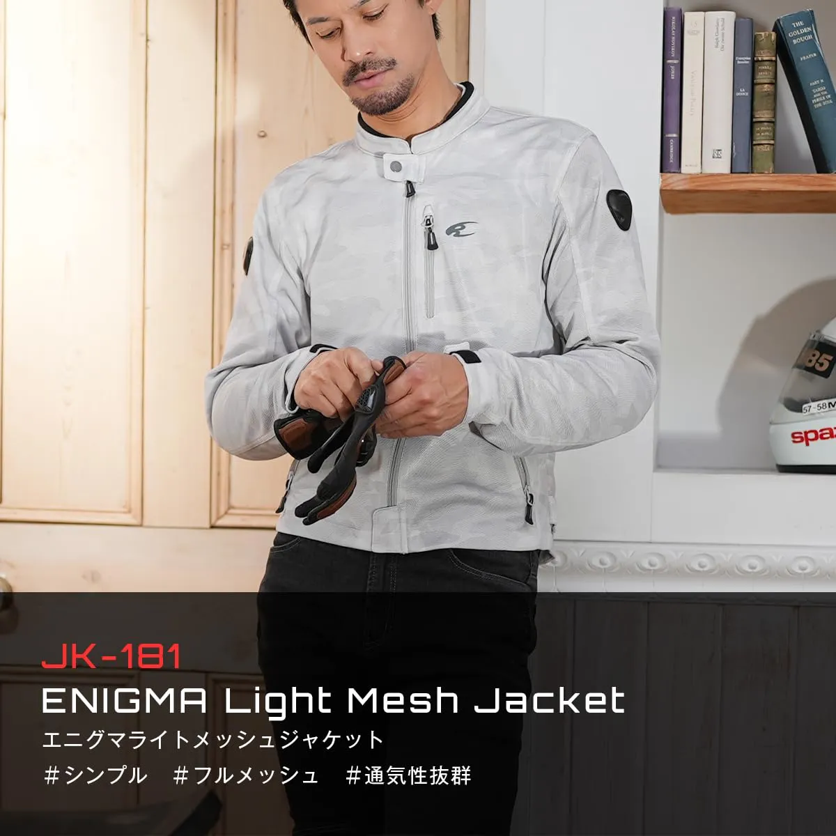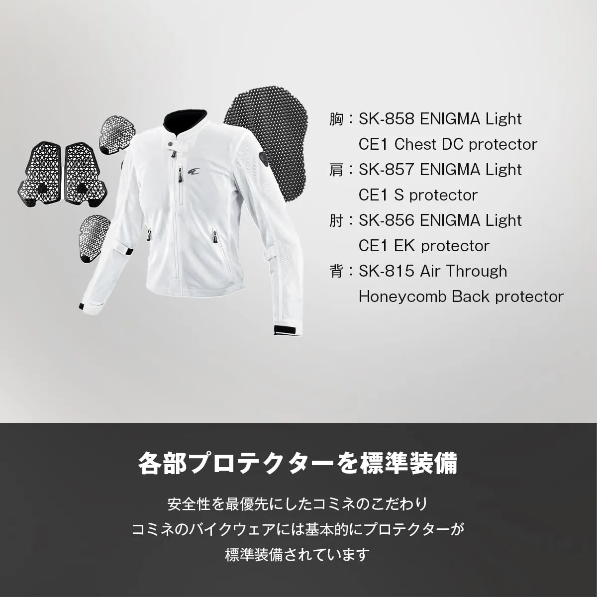 メッシュ生地を全面に使用し、走行風を効果的に取り込むフルメッシュジャケット。インナープロテクターには通気性の高い薄型CEレベル1のソフトプロテクターを肩、肘、胸に、更に背中にはハニカム仕様のEVAパッドを装備。