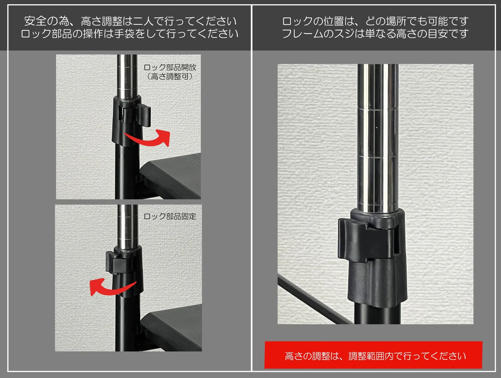 【高さの調整】70cm~100cmまで1mm単位でも調整が出来ます(フレームの溝は高さを合わせる目安です)、高さを調整する際は天板に物を置かずに、必ず2名で行ってください。