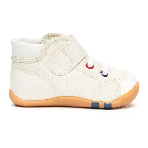 日本製のバルカナイズド製法のベビーシューズです。足の成長を促進する4大機能「つま先ゆったり」「靴底の屈曲性」「かかとのガッチリカウンター」「洗えるインソール」を搭載しています。また、天然緑茶を原料とした「カテキン」加工を施し、優れた抗菌・防臭効果を発揮します。踵部のギザギザの刺繍は、久留米の工場を表しています。 ブランド紹介