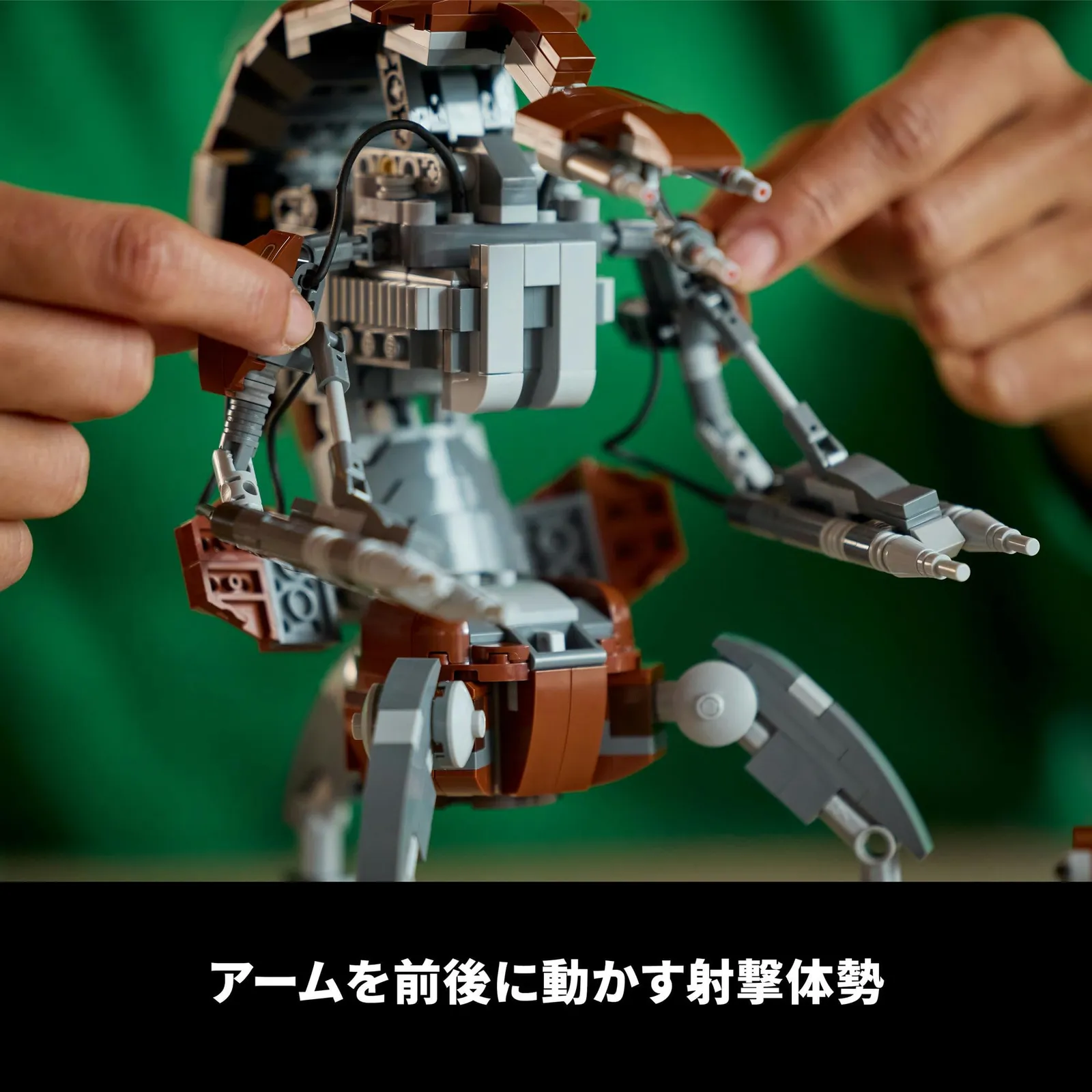 『スター・ウォーズ エピソード1/ファントム・メナス』に登場した「ドロイデカ」が、ブロックの組み立てモデルになった。アームを前後に動かして、銃撃の動きを再現してみよう。脚を付け替えればボール状に変形できるよ。専用スタンドに情報プレートとレゴ(R)スター・ウォーズ 25周年記念ブロック、「ドロイデカ」のフィギュアといっしょに飾れば、カッコいいディスプレイの出来上がり。