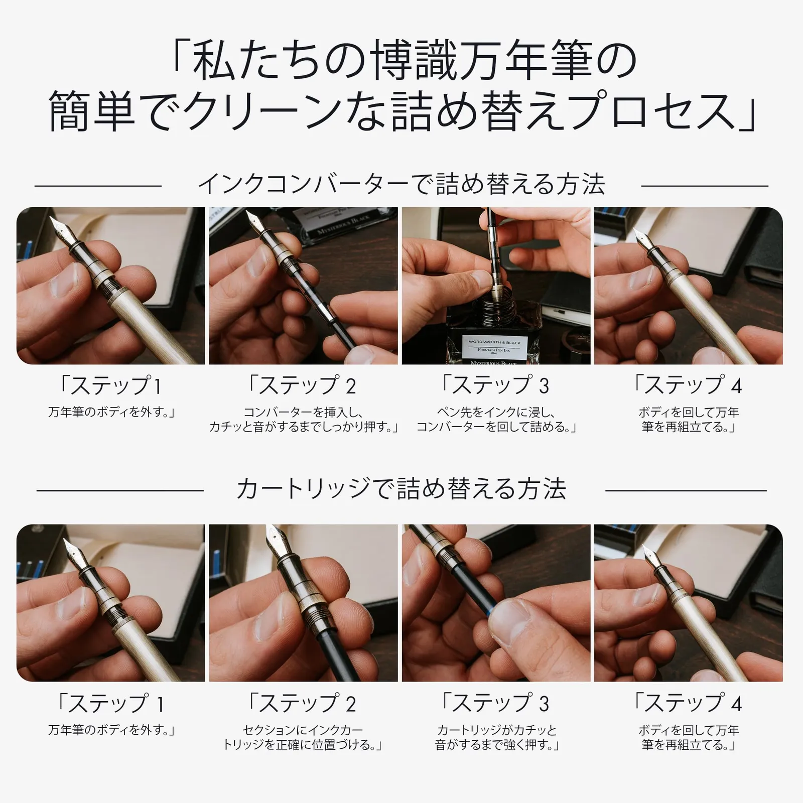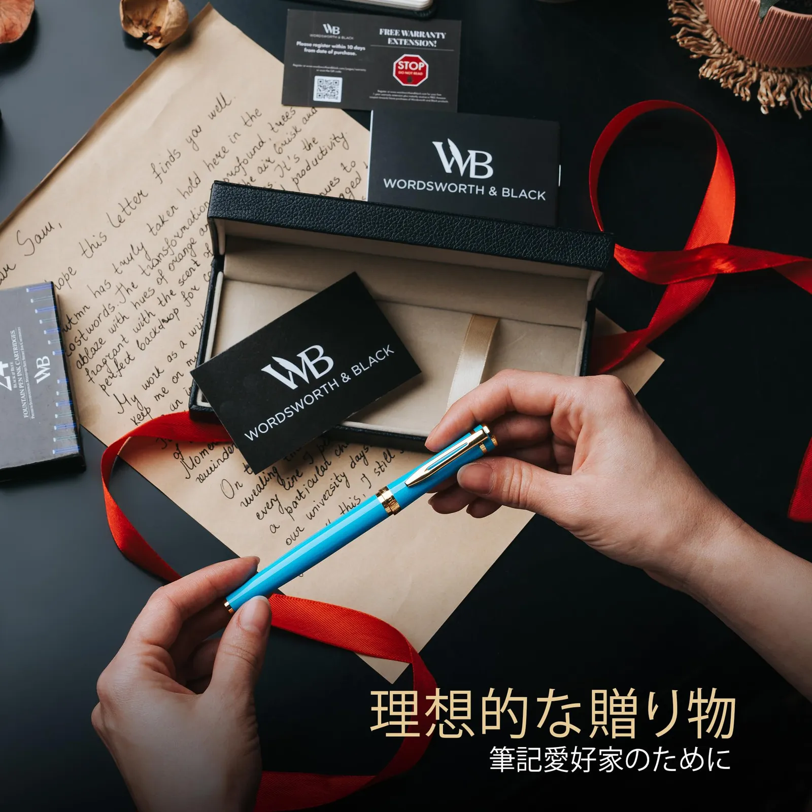 ?? オールインクルーシブの詰め替え式万年筆セットを発見 - 豪華な万年筆、インクコンバーター、3 x ブルーインクカートリッジ、3 x ブラックインクカートリッジ、プレミアムレザーペンケース、デラックスギフトボックスが含まれています - すぐにプレゼントできます。 すべてのご注文には、ワーズワースと黒のペン セットの完全な説明書が含まれています。 豪華な筆記具を使い始めて楽しむために必要なすべての情報がすぐに手に入ります。
