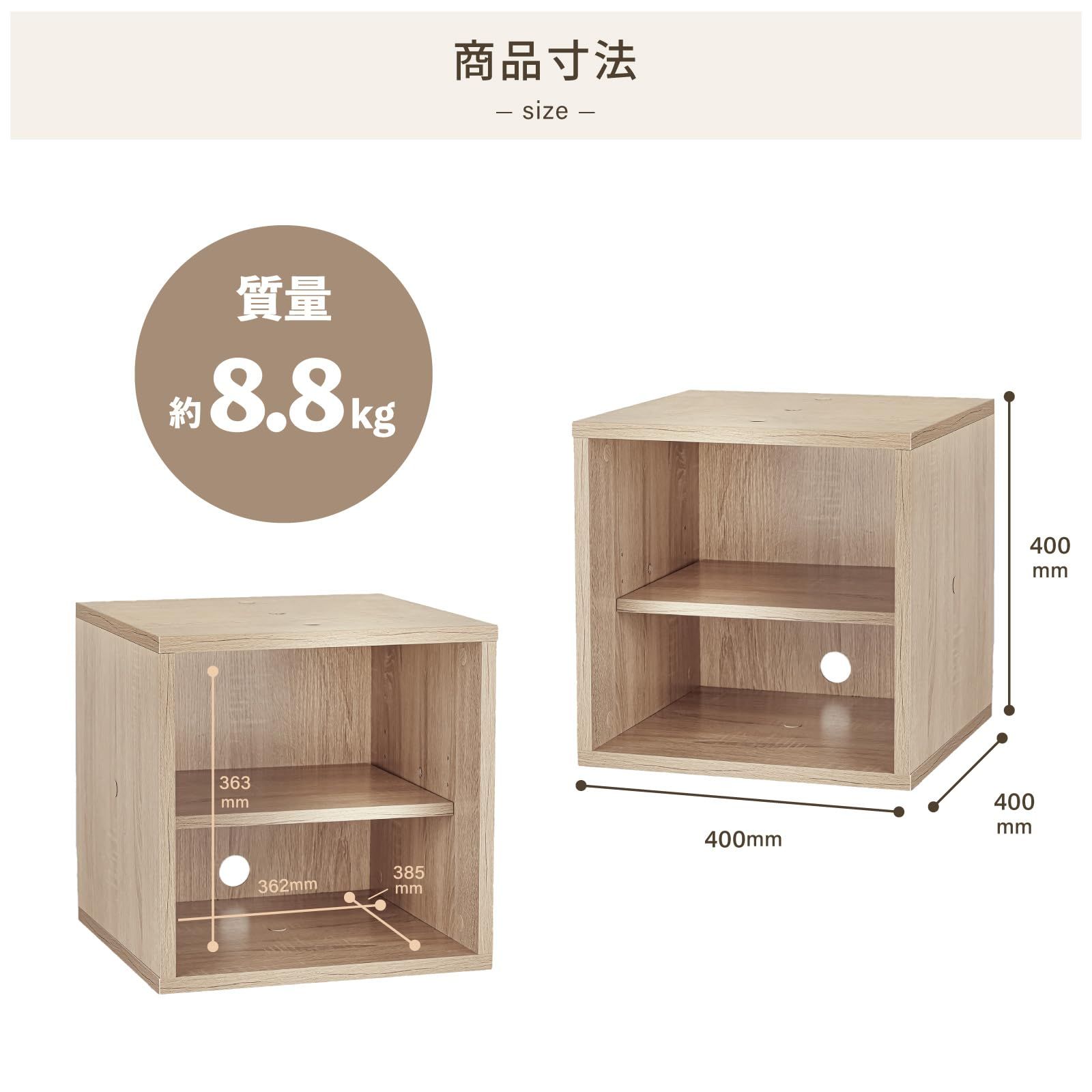 材質:メラミン加工パーティクルボード、外形寸法:W400×D400×H400mm、質量:8.8kg