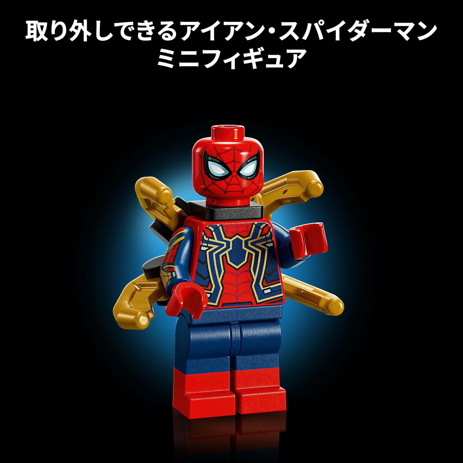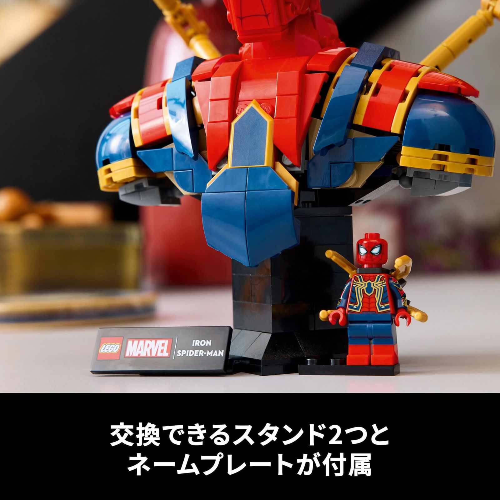 どこまでもリアルそのもの ? 頭部が回転するフィギュアには、レゴ アイアン・スパイダーマンのミニフィギュアが付属しています