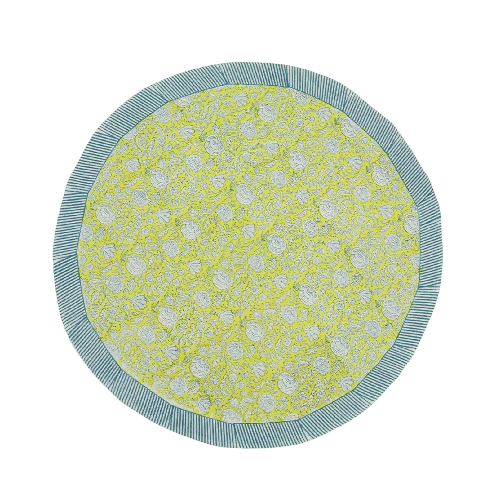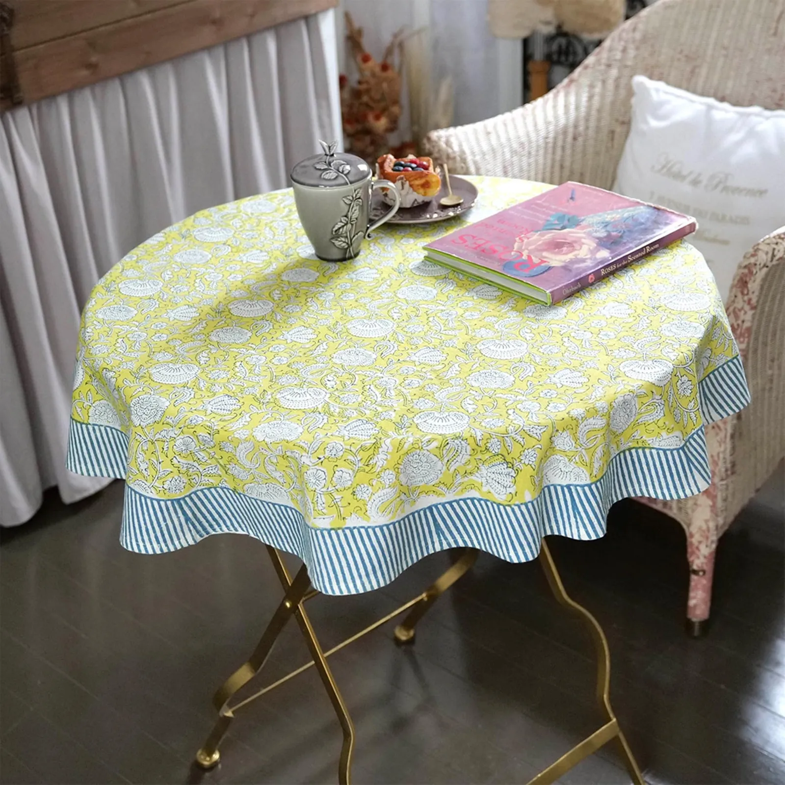 心地よい空間づくりにぴったり!落ち着いた色調のブロックプリントのラウンド型クロスです。