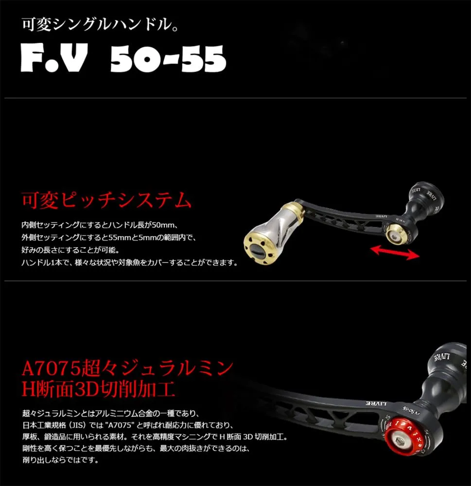【F.V 50-55】……「可変ピッチシステム(50mm~55mm)」で様々な状況下や対象魚をカバーできる、超々ジュラルミン製・可変シングルハンドル!!