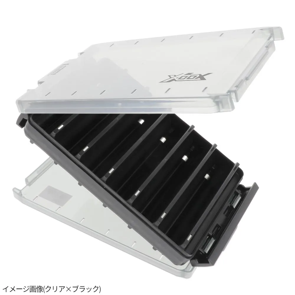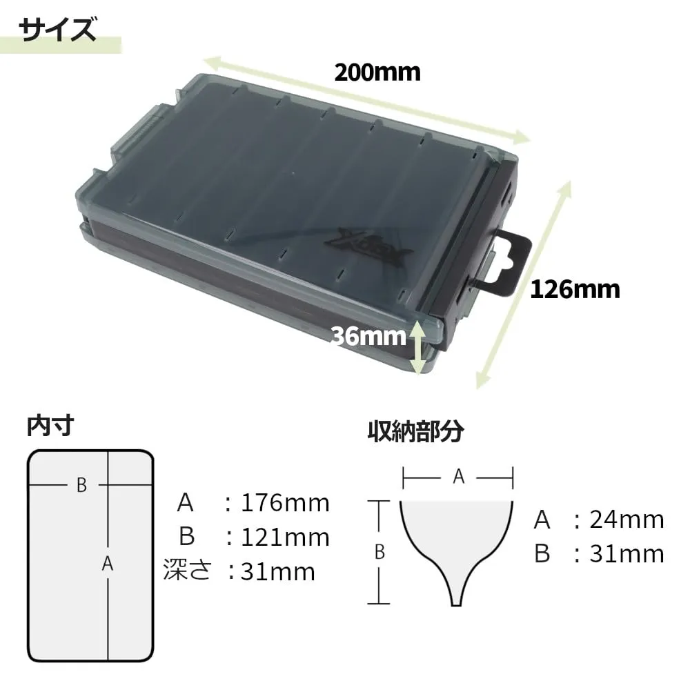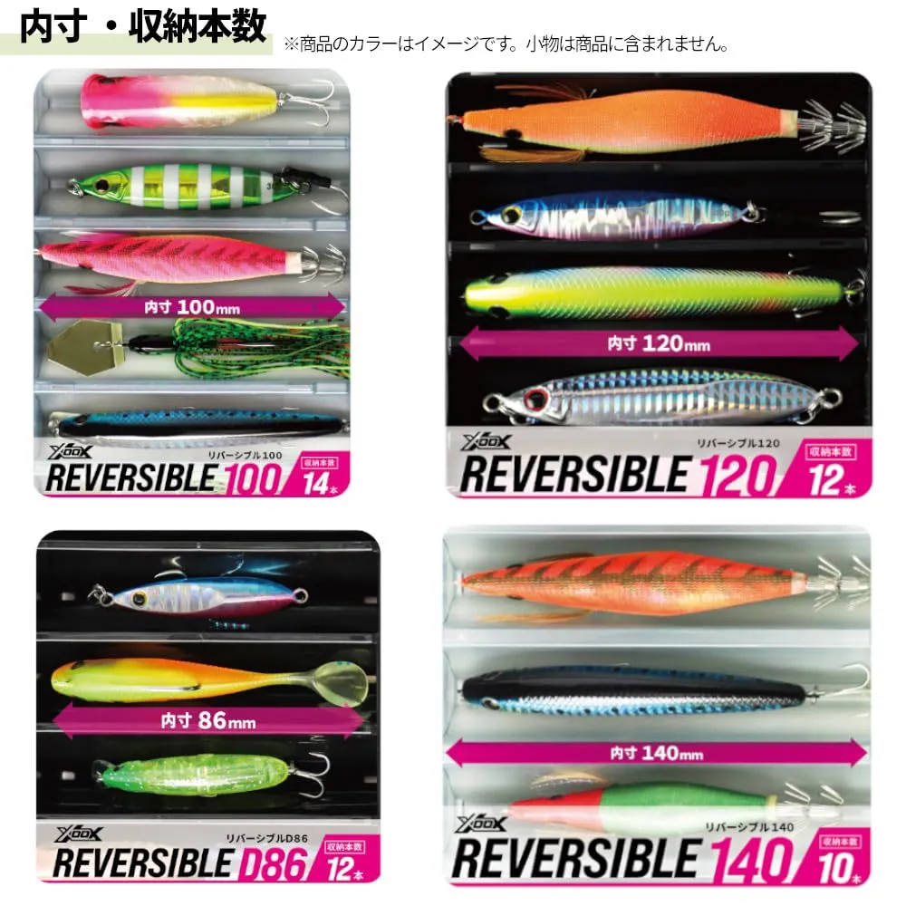 明邦化学工業とのコラボ、リバーシブルシリーズ。対面トライアングル構造でスペースを効率的に使用できる両面収納タイプのタックルケース!110mm程度のプラグや3.0号以下のエギ・スッテ、80g程度のメタルジグの収納に!フックを付けたままでも絡みにくく、使用後はボックスごと丸洗い可能な水抜きダクト付き。[エックス・オー・エックス][JE-170]