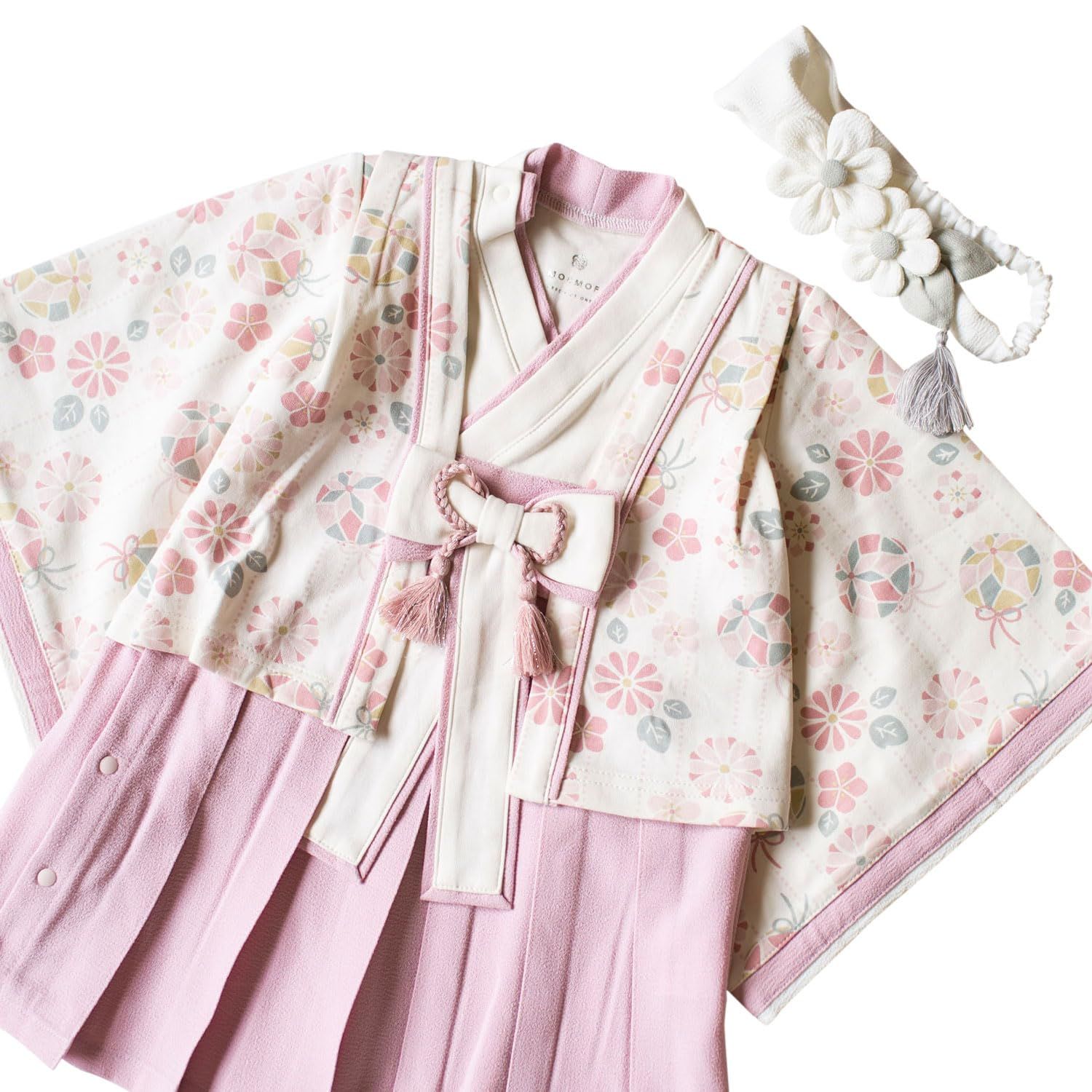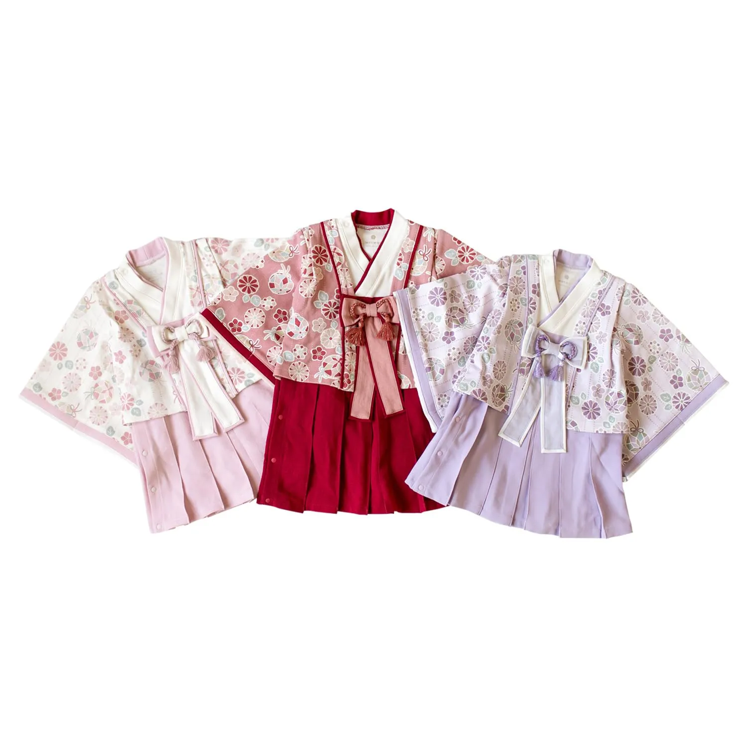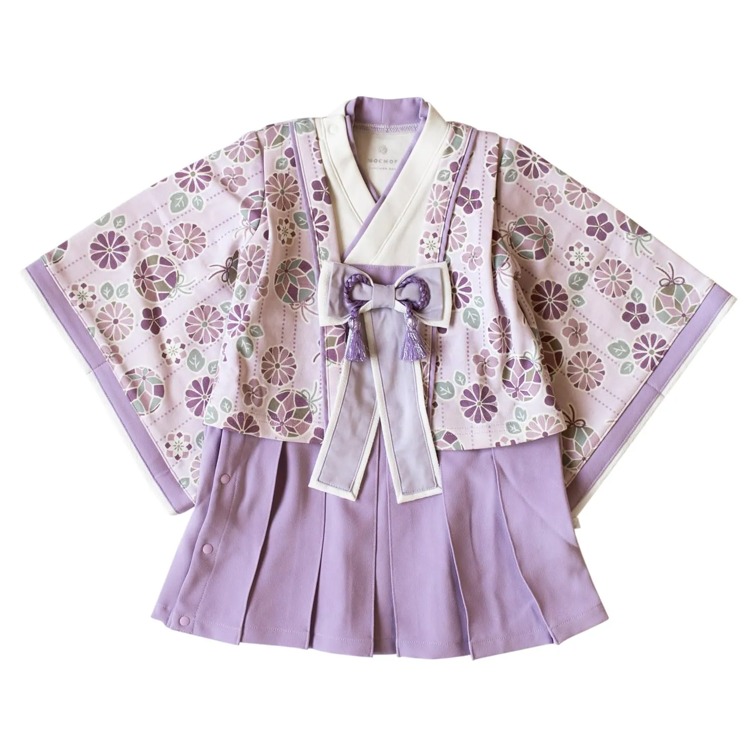 「十二単をイメージしたお姫様のようなドレス」特別な日のおめかしにぴったりの袴デザイン。節句のイベントにはもちろん、お宮参りやお食い始め、お正月の挨拶、記念日の撮影などにもおすすめです。十二単をイメージした、特別なプレミアムバージョン。華やかで特別な一着で、晴れの日のお祝いを盛り上げます。上下繋がったロンパース型なので、これ1枚着せるだけでコーディネートが完成。脇のスナップボタンで上から下まで全開出来る仕様で、お着替え楽々です。