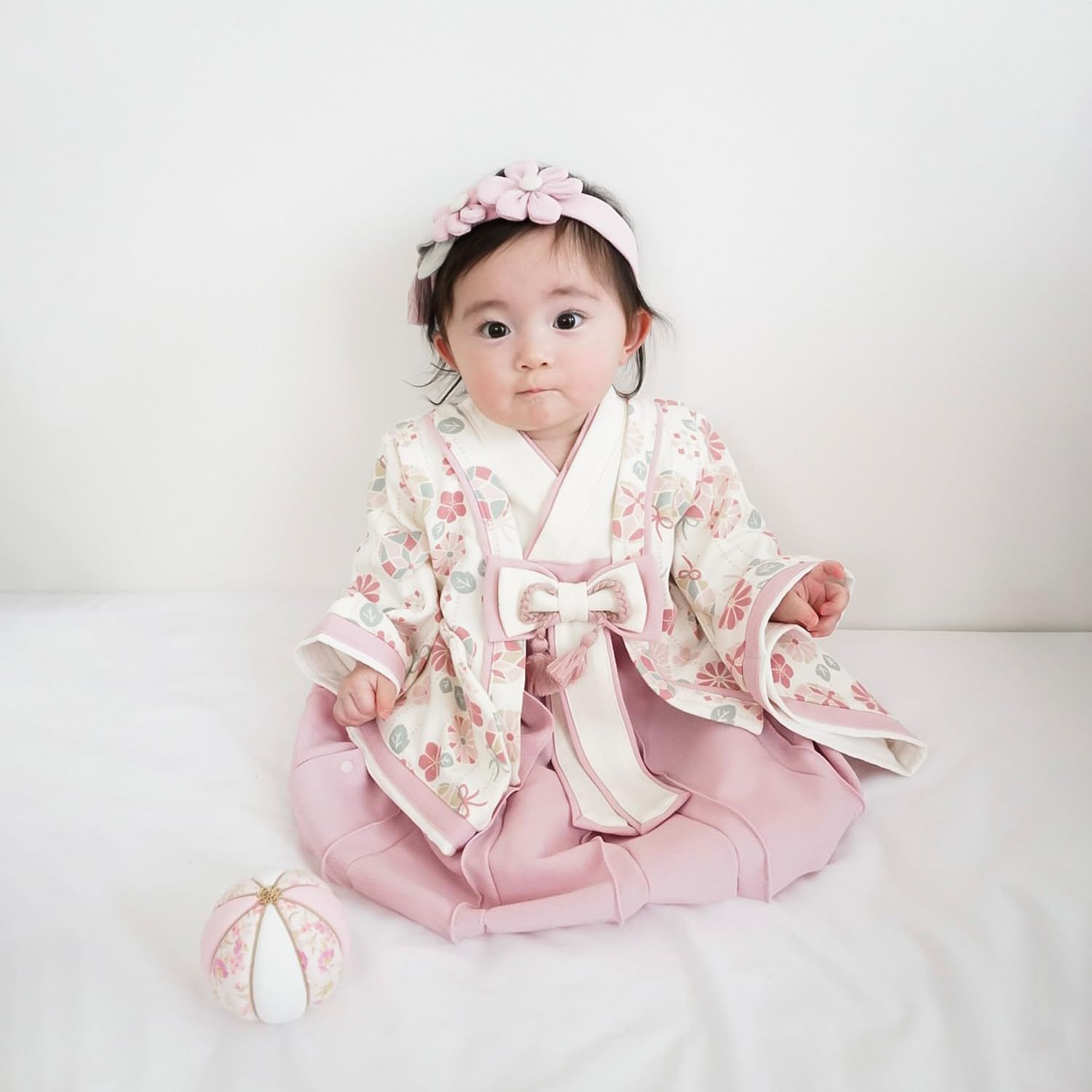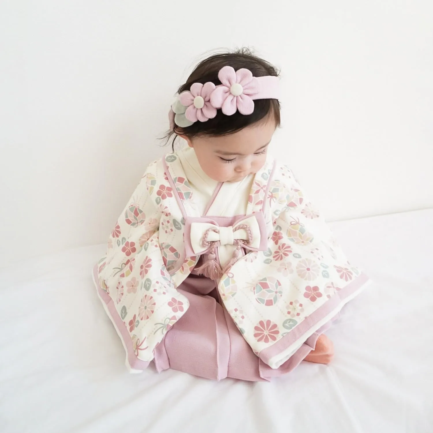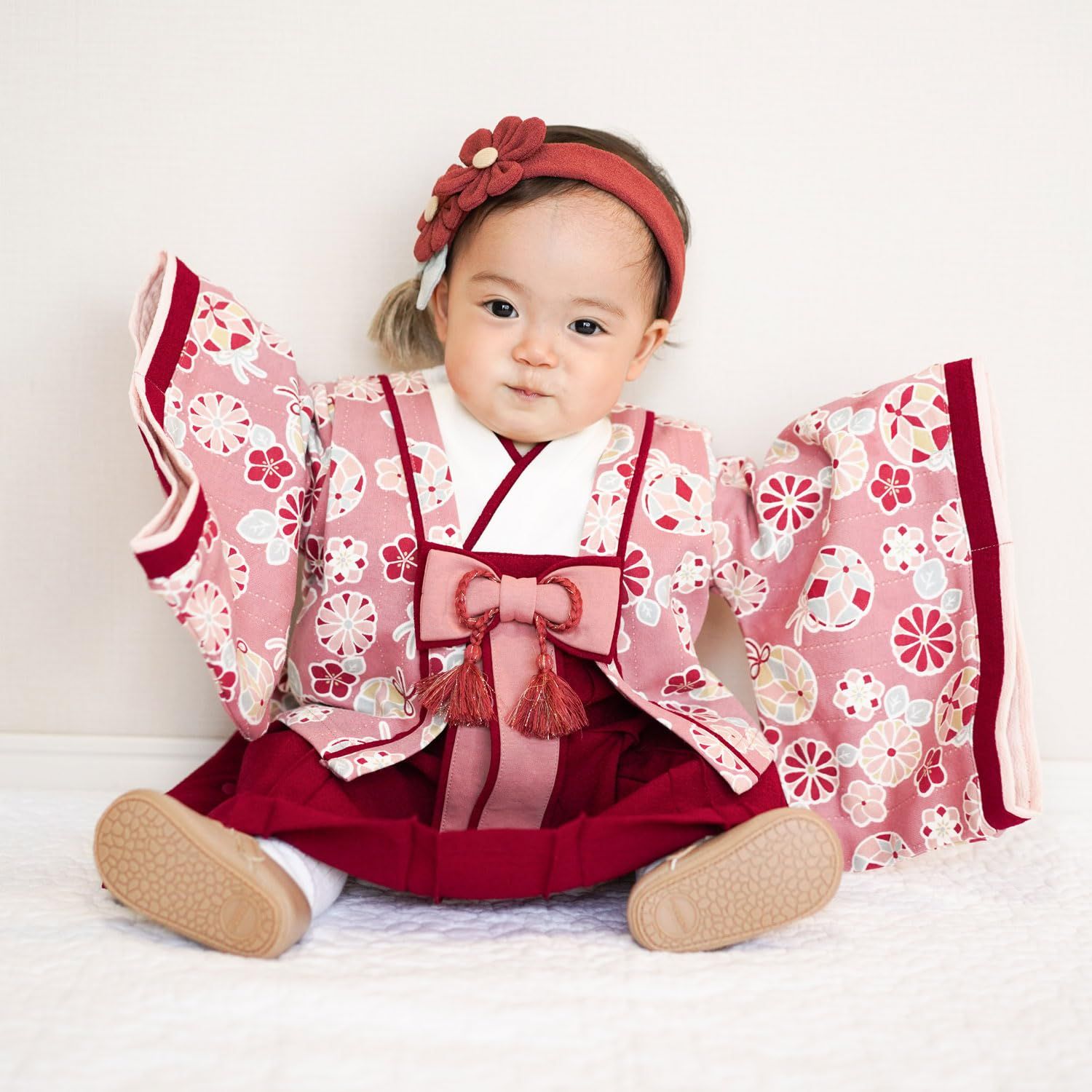 「十二単をイメージしたお姫様のようなドレス」特別な日のおめかしにぴったりの袴デザイン。節句のイベントにはもちろん、お宮参りやお食い始め、お正月の挨拶、記念日の撮影などにもおすすめです。十二単をイメージした、特別なプレミアムバージョン。華やかで特別な一着で、晴れの日のお祝いを盛り上げます。上下繋がったロンパース型なので、これ1枚着せるだけでコーディネートが完成。脇のスナップボタンで上から下まで全開出来る仕様で、お着替え楽々です。