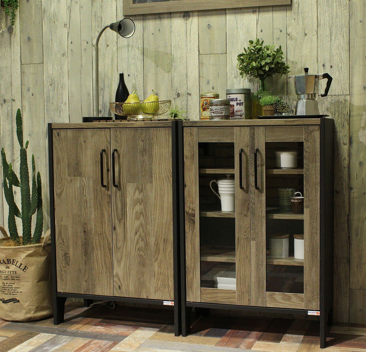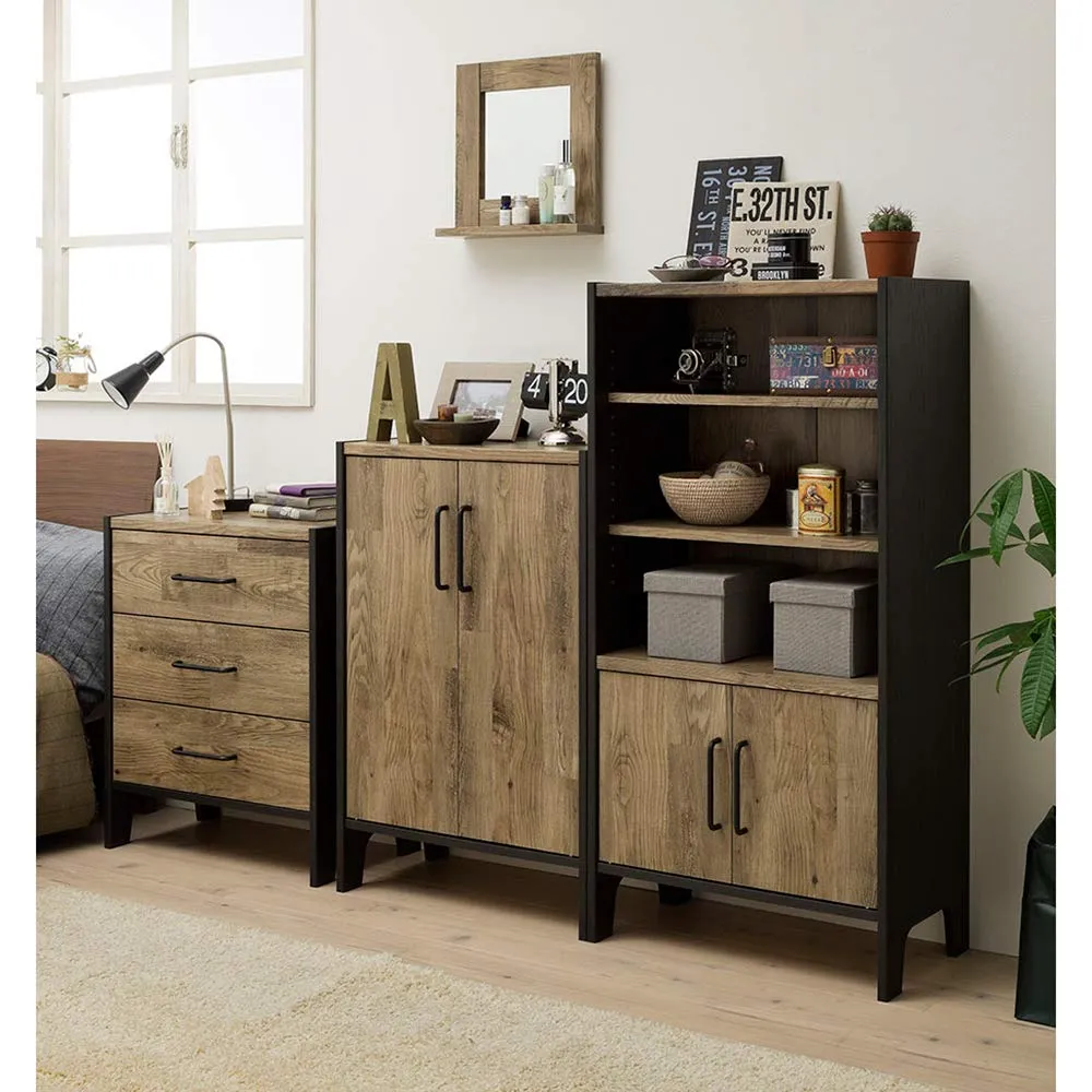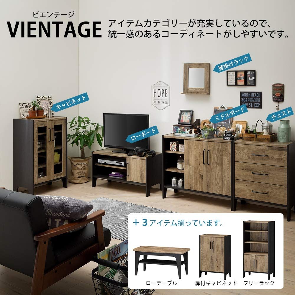 オシャレさとかっこよさを楽しめるアメリカンビンテージテイストの『ビエンテージ』。VNT-9060Dは扉付きのキャビネット 本棚。組立が苦手な女性でも簡単に組立が出来るタナクイックを採用。組立時間を約65%短縮(当社調べ)します。こだわりの古材風シートは長年使い込んだような風合い。インダストリアル調の引き手が男前インテリアスタイルを演出します。