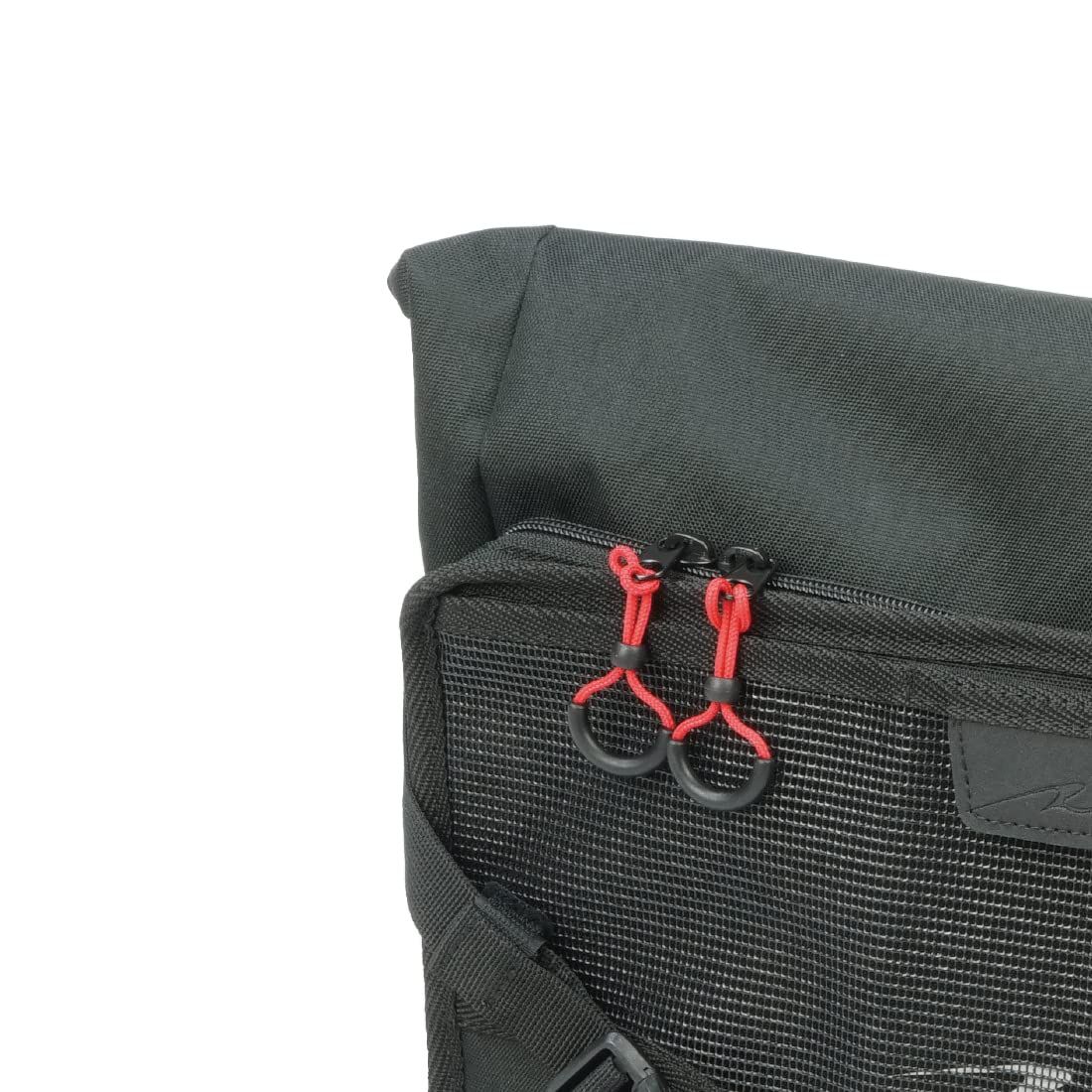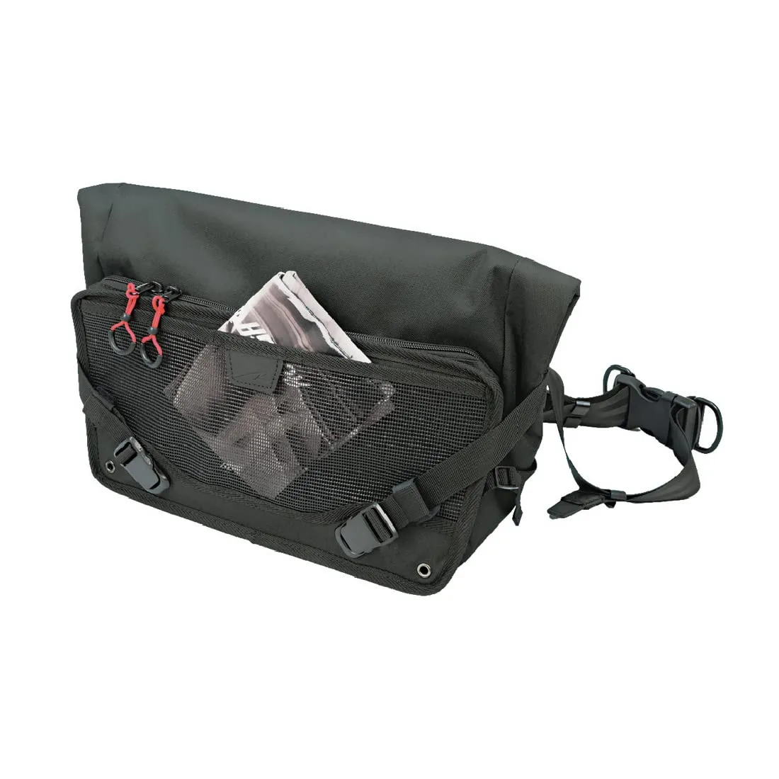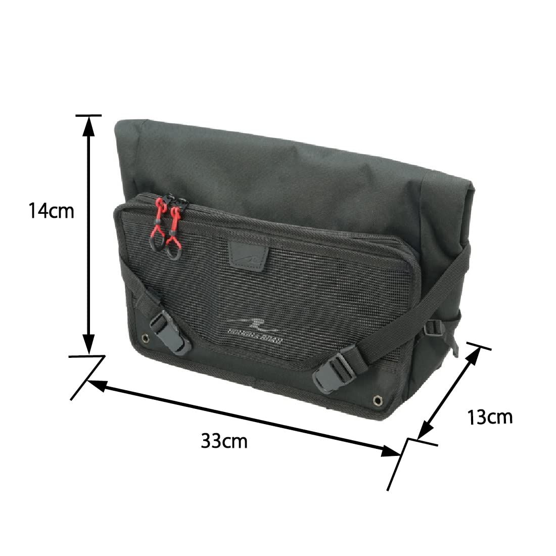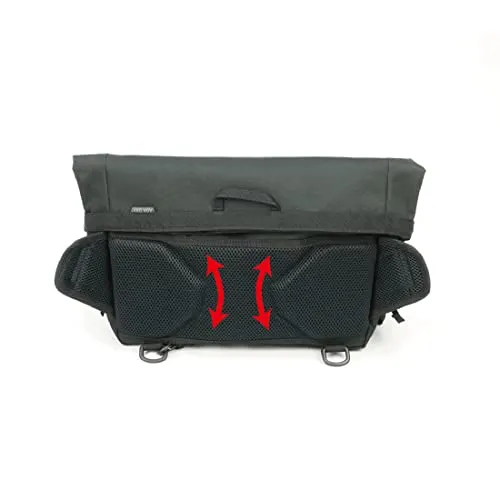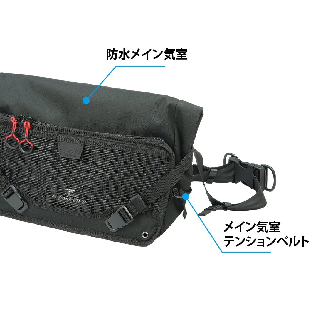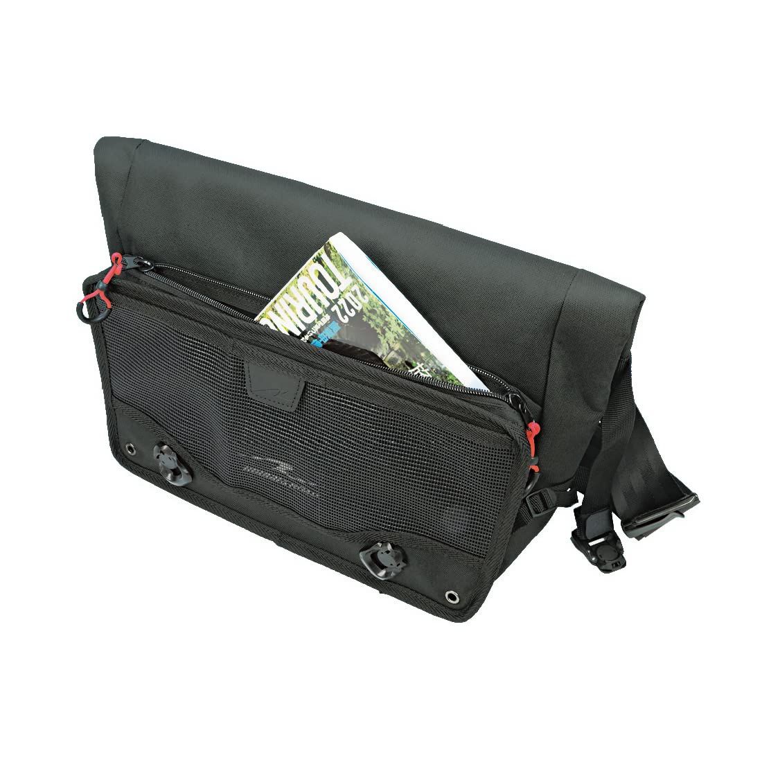 右掛け左掛け両用を考量したシンメトリー設計でユーザーを選ばず、メッシュポケットと大型ファスナーポケット(非防水)を備えた補強板入りフロントパネルをサイドのテンションベルトで調整することで、シルエットを崩すことなく荷物の増減に対応しバッグの安定感を高めます。