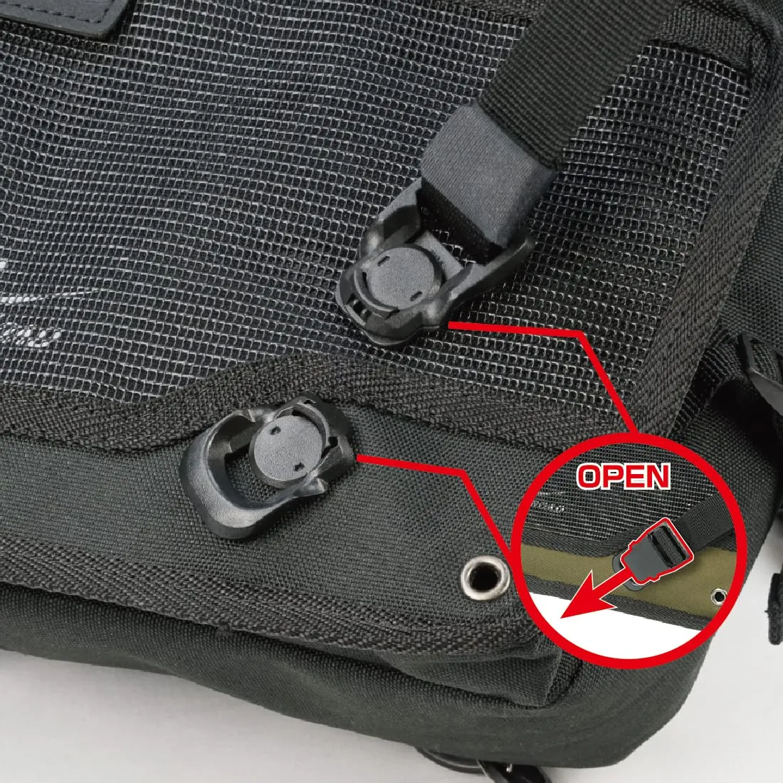 新採用のマグネットバックルは片手での着脱を可能にし、ショルダーベルトはDリングを引けば即座に緩み、ベルト端を引けば締まるQ.C.Rシステムを備え、バッグの開け閉めの煩わしさから解放されます。