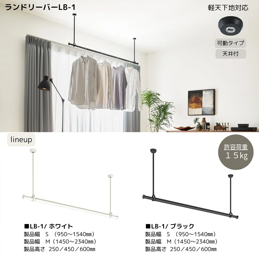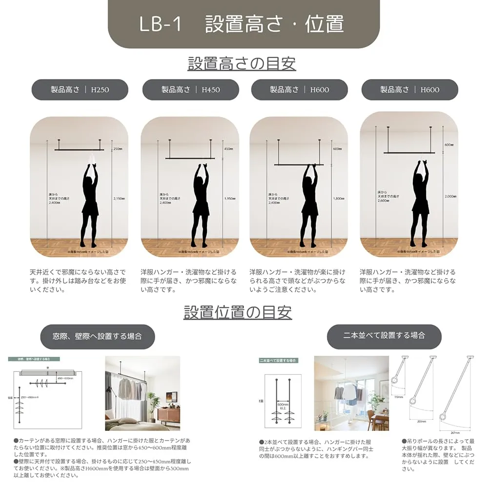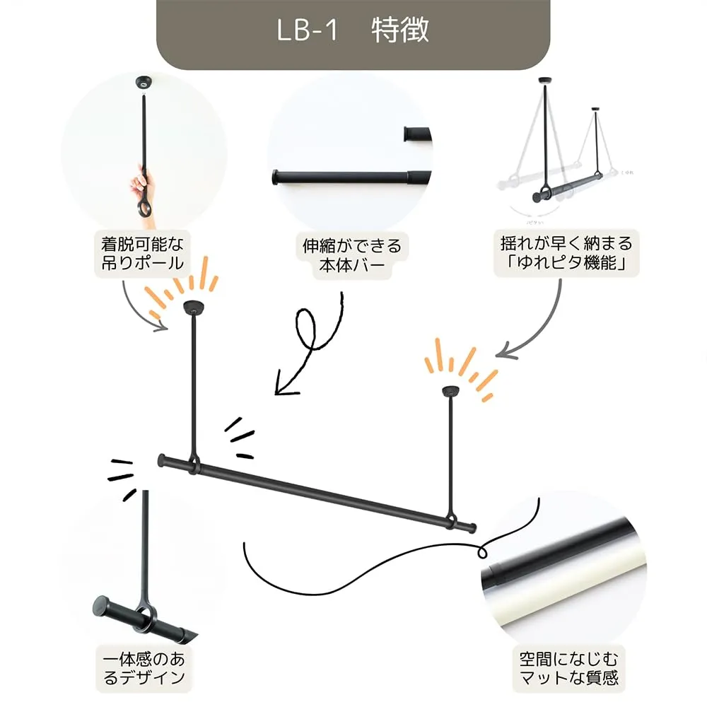 ワンタッチで吊りポールを着脱でき、使わない時はスッキリ収納可能。主要パーツは同色仕上げで一体感のあるデザインに。マット塗装で室内物干しの存在感を抑え、空間に自然に溶け込みます。揺れを素早く抑える「ゆれピタ機能」付き。本体バーはS・Mの2サイズ展開で、お部屋に合わせて簡単に伸縮できます。