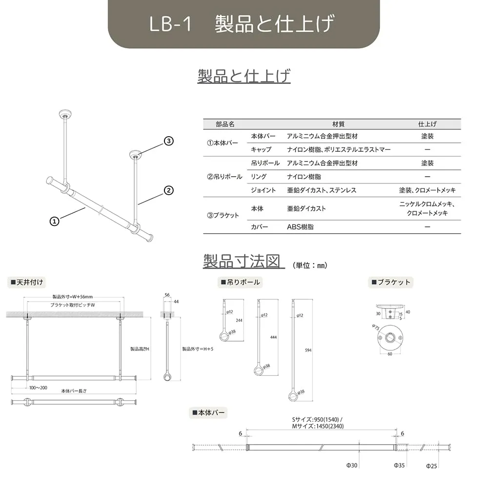 【材質】本体バー:アルミニウム合金押出型材(塗装仕上げ)、ナイロン樹脂、ポリエステルエラストマー 吊りポール:アルミニウム合金押出型材(塗装仕上げ)、ナイロン樹脂、亜鉛ダイカスト、ステンレス ブラケット:亜鉛ダイカスト、ABS樹脂