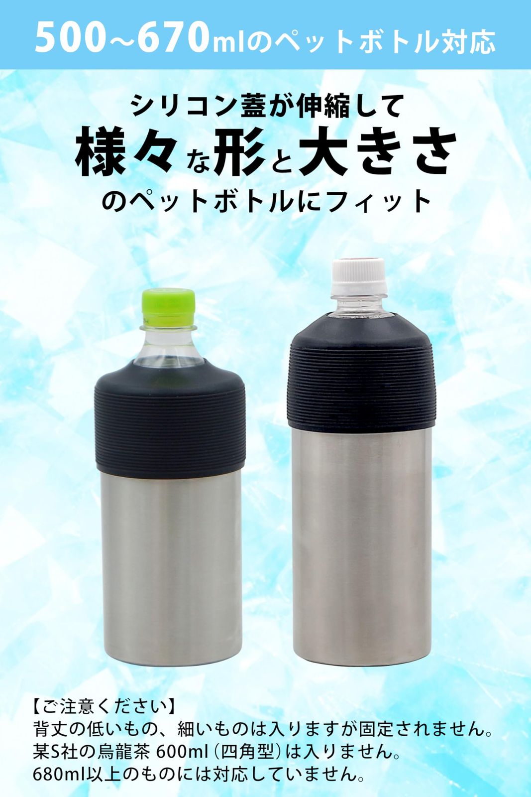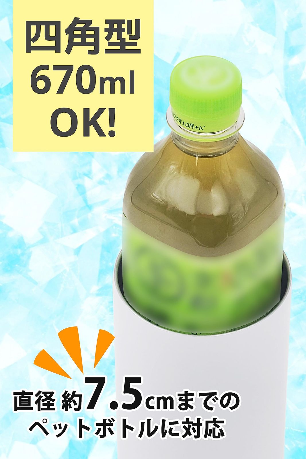 対応ペットボトル:500~670ml 角型ペットボトルにも対応!※背丈の低いもの、細いものは入りますが固定されません。某S社の烏龍茶 600ml(四角型)は入りません。680ml以上のものには対応していません。
