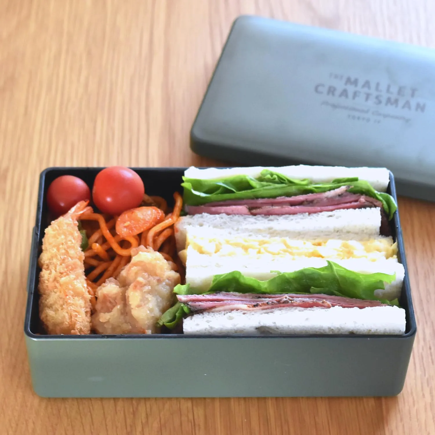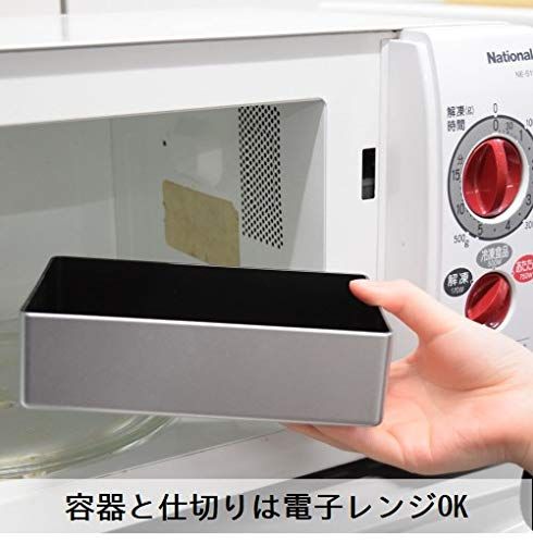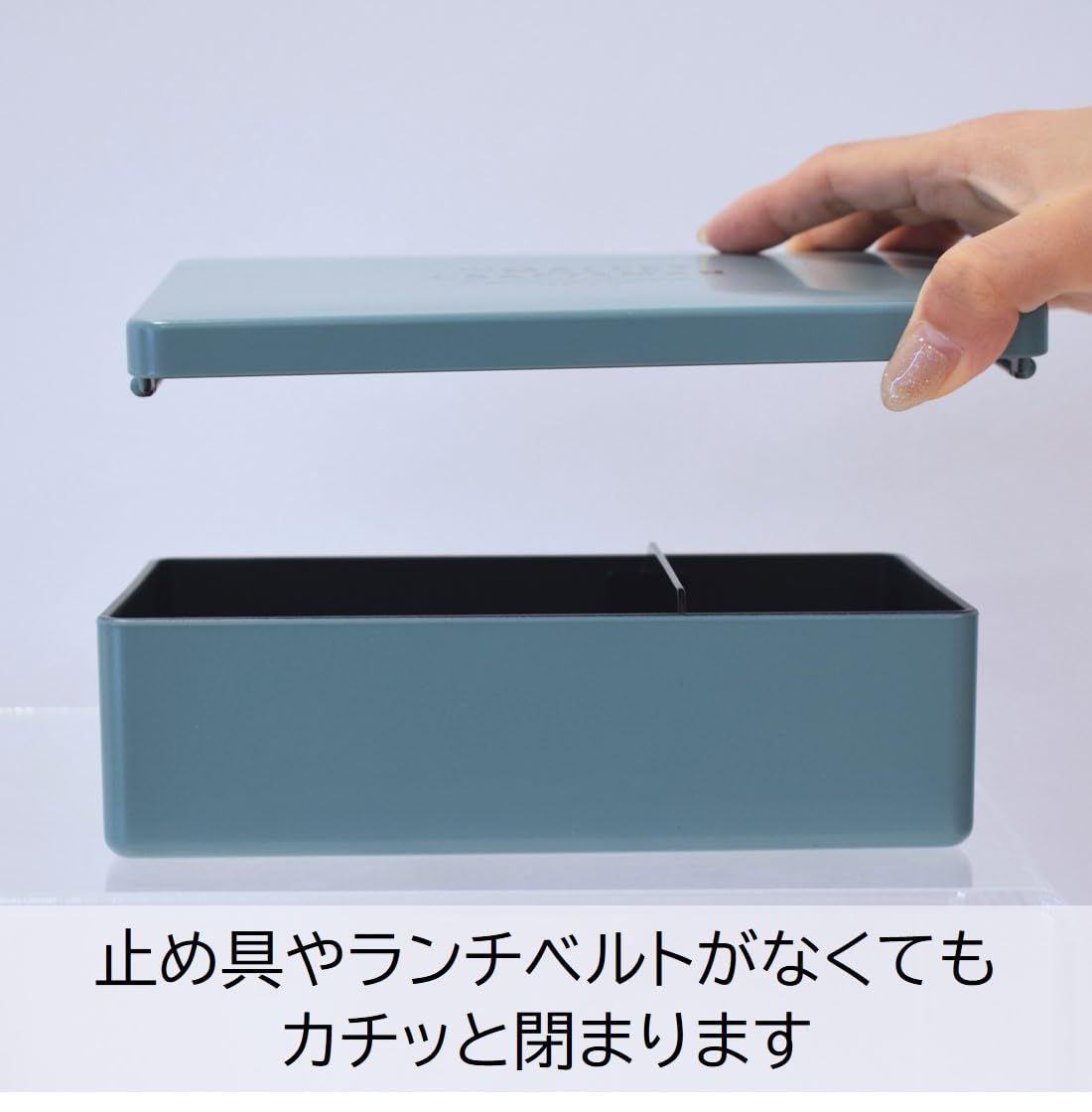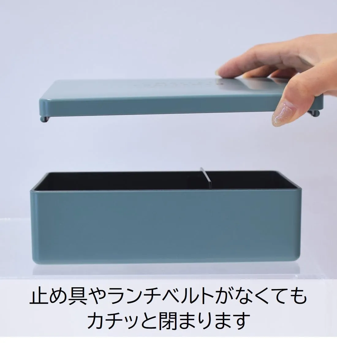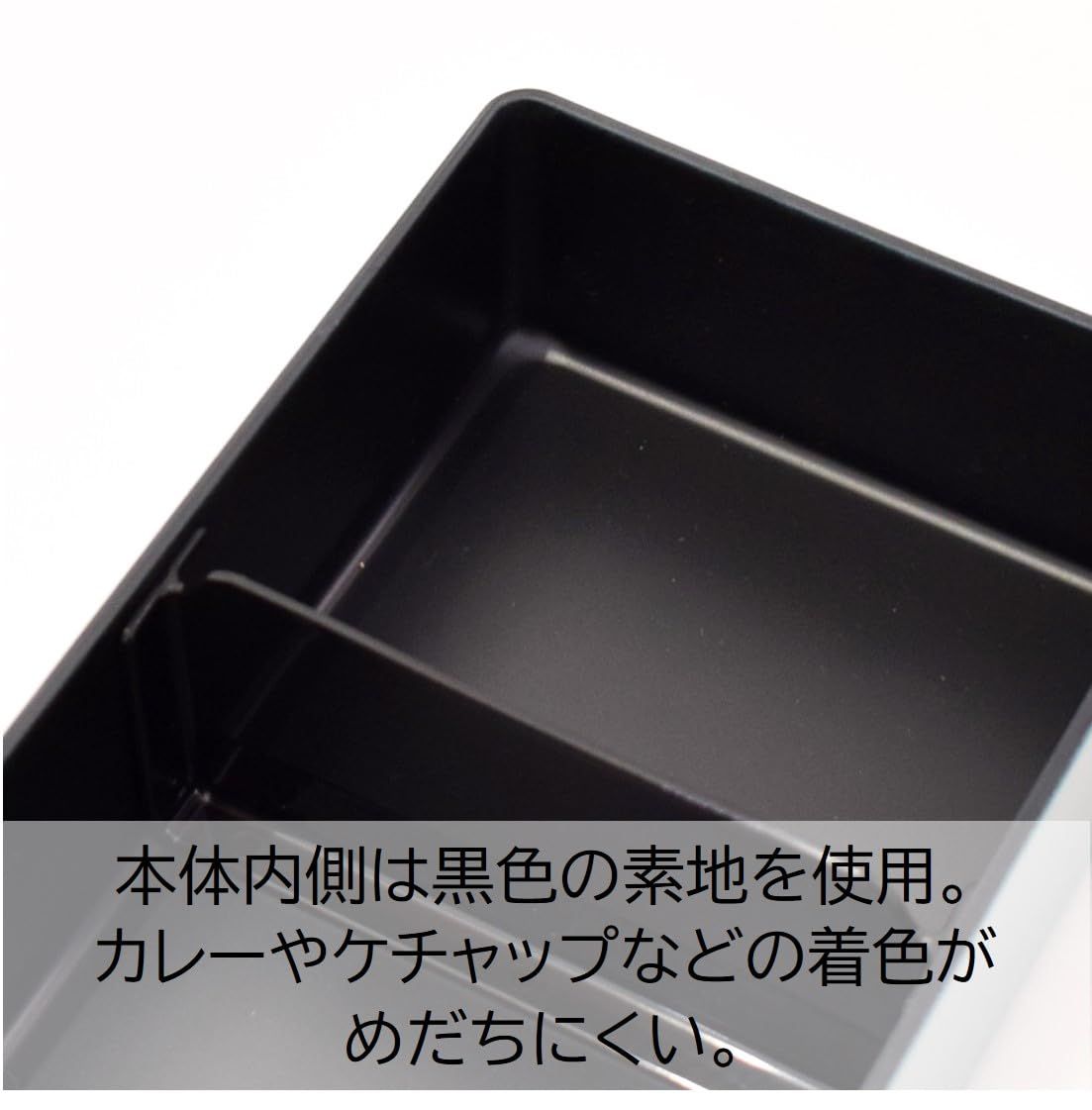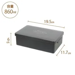 スクエア型ででっぱりがなくシンプルな1段弁当箱。容量860mlと大容量サイズ。止め具やバンドを使わなくてもしっかり閉まるフタがポイントです。フタ裏にはパッキンも付いているので、汁漏れしにくい構造。本体の内側が黒色の素地を使用しています。カレーやケチャップなどの着色が目立ちにくいのも嬉しい。仕切り付き。フタを外してレンジOK。食洗機OK。安心の日本製。