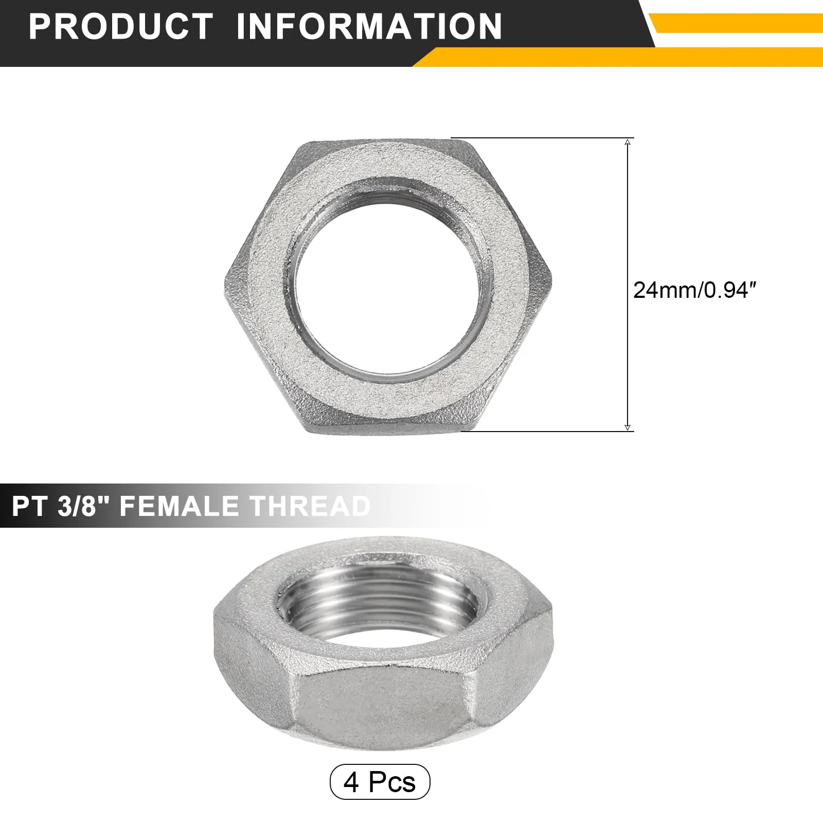 サイズ&パッケージ: パッケージには4個の六角ロックナットが含まれています。スレッドサイズはPT 1インチで、六角ロックナットの外径と厚さは24x6.5mm(0.94x0.26インチ)です。