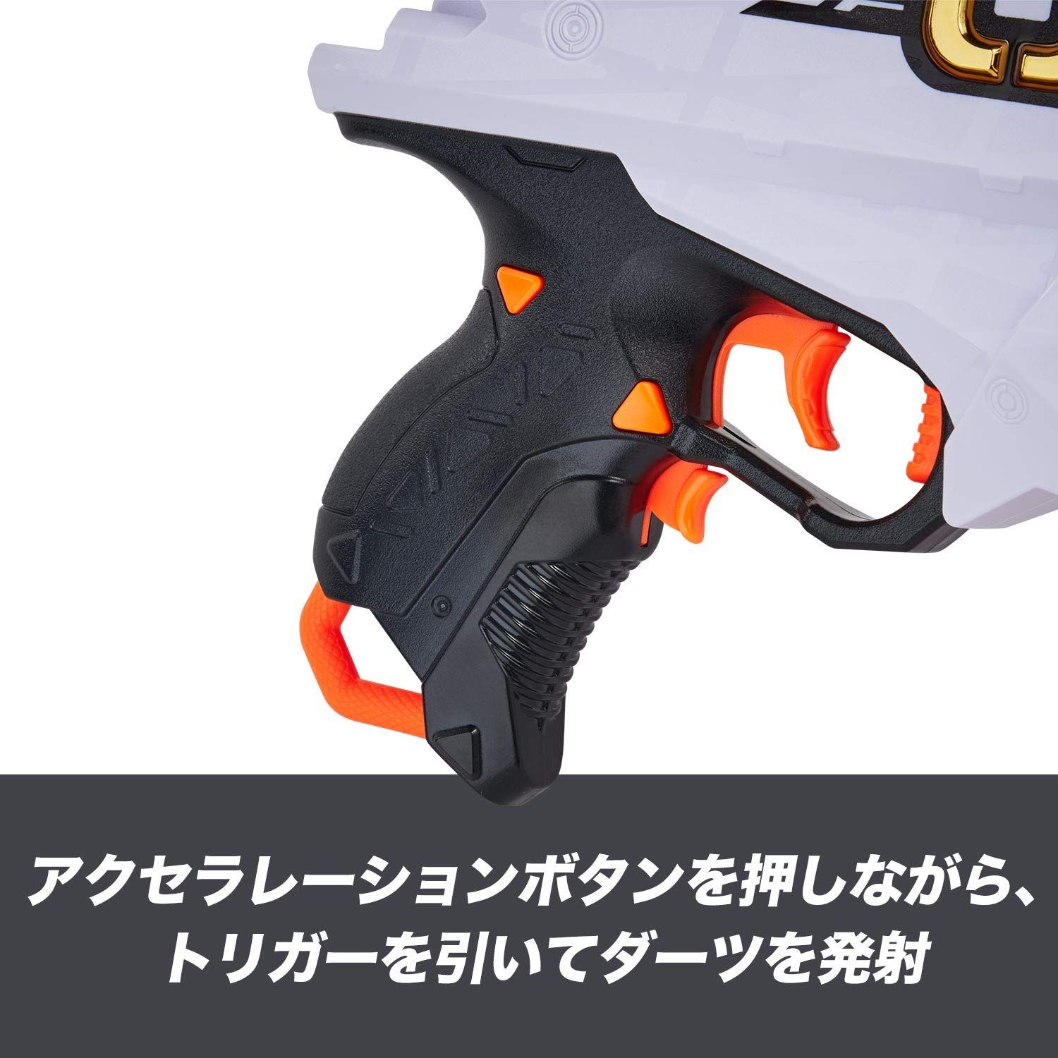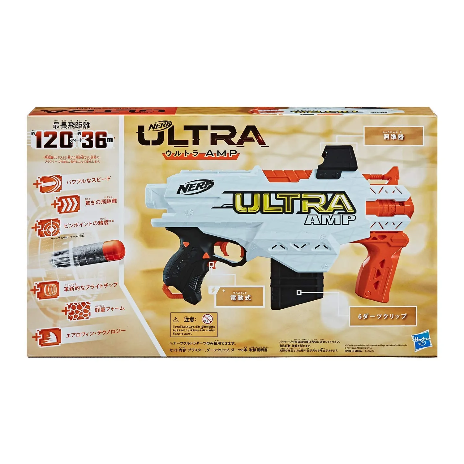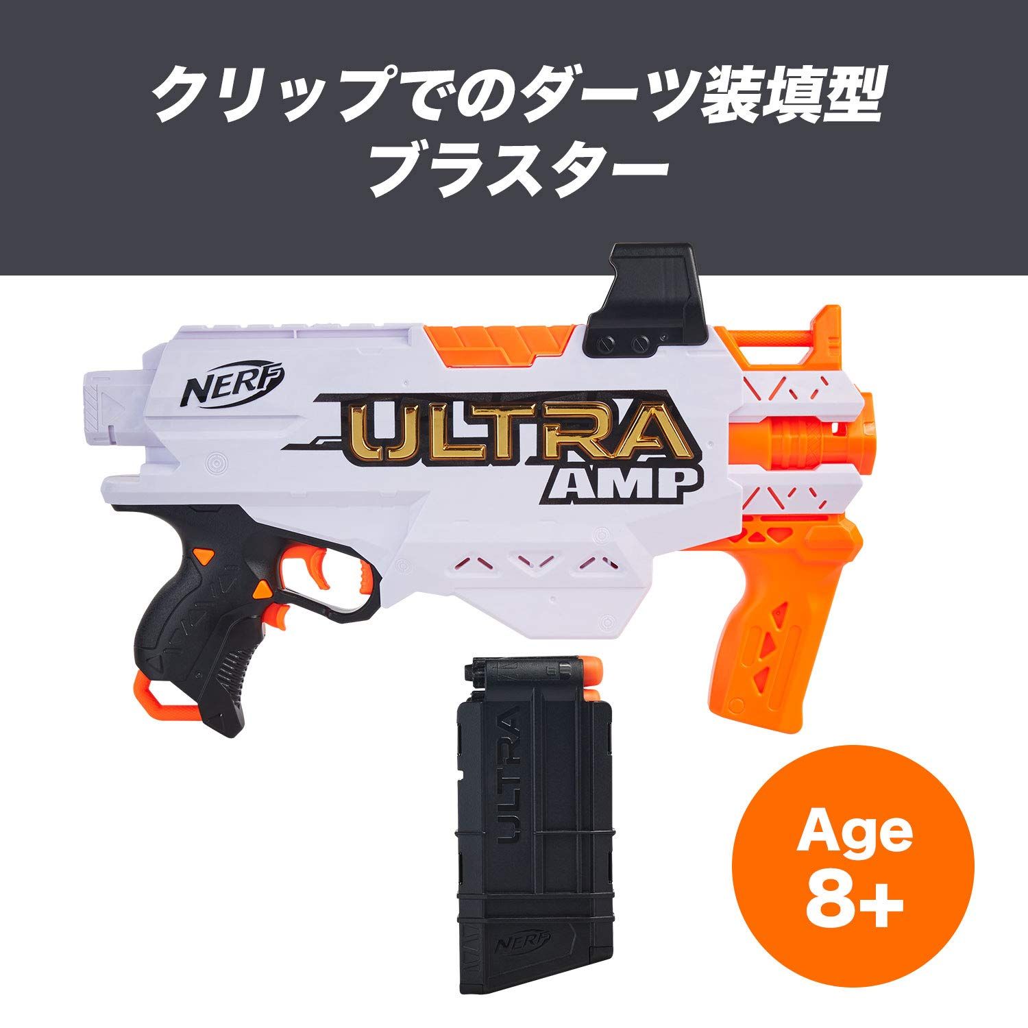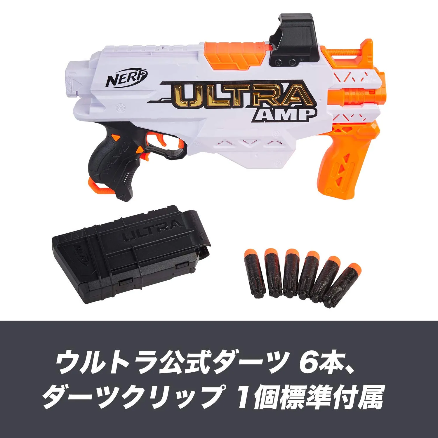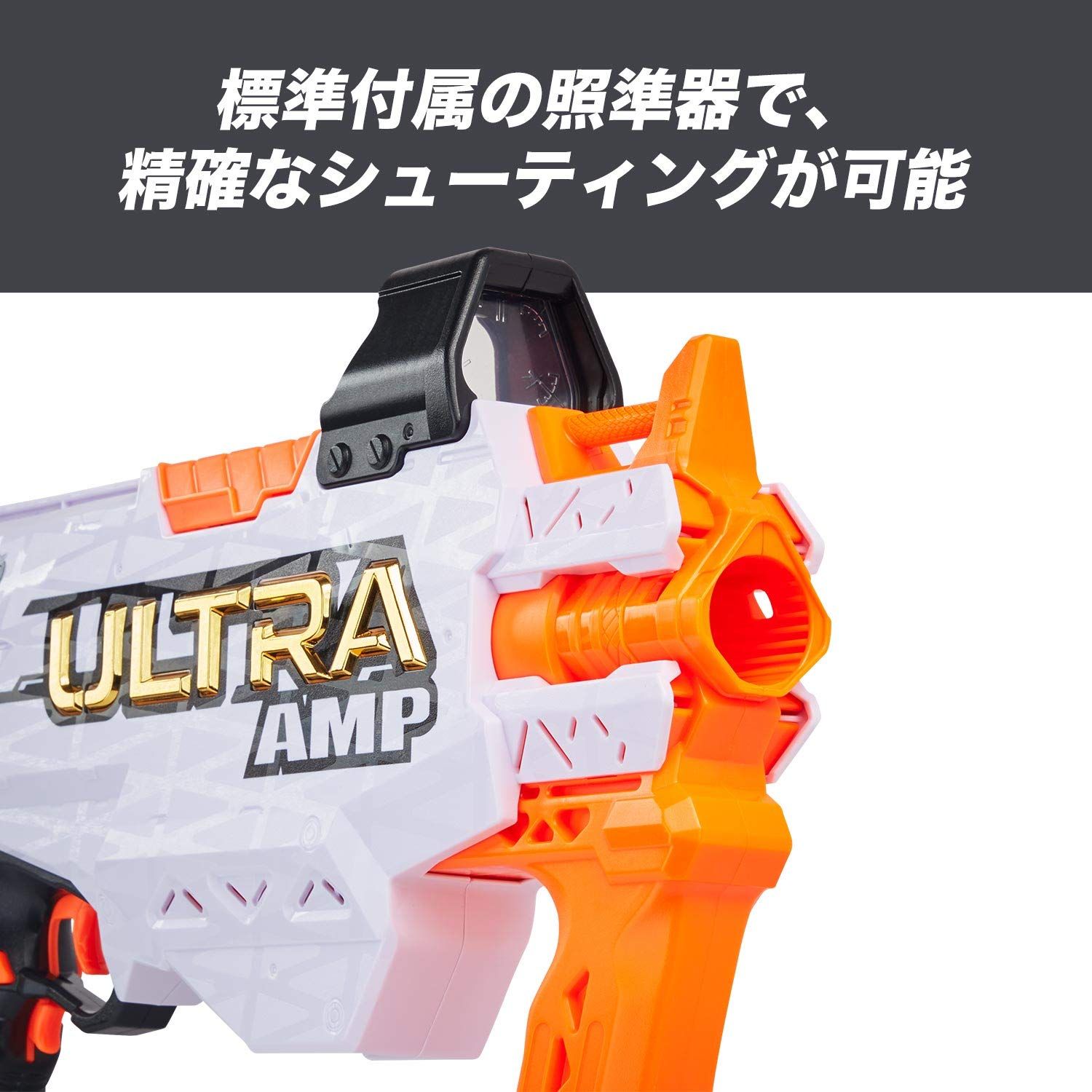 本ナーフ ウルトラ AMPは、ダーツを素早く発射、連射ができる電動ブラスターです。ウルトラシリーズ専用ダーツを6本格納できるダーツクリップが標準付属しており、簡単にダーツを装填、リロードして発射することができます。アクセラレーションボタンを押しながら、トリガーを引くと、ダーツが1本発射されます。また、シューティングの命中率を上げる照準器が標準装備されています。