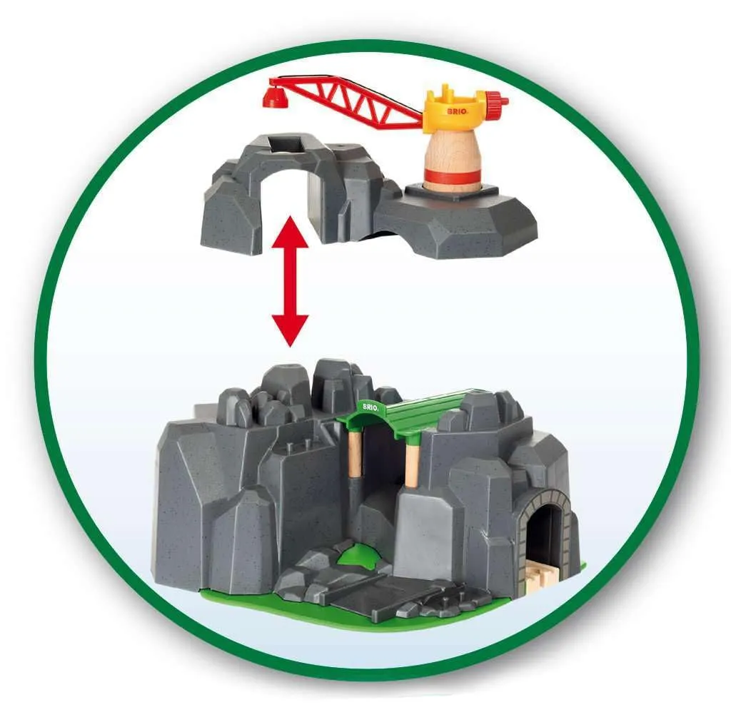 【リフト&ロード】新しい発見がたくさん詰まったクレーン&マウンテントンネル。 クレーンのついた山頂部分を外して、レールをくぐらせれば2つのトンネルで遊べます。 遊び心いっぱいの機能とデザインの宝の山です。もしかしたら金が見つかるかも!