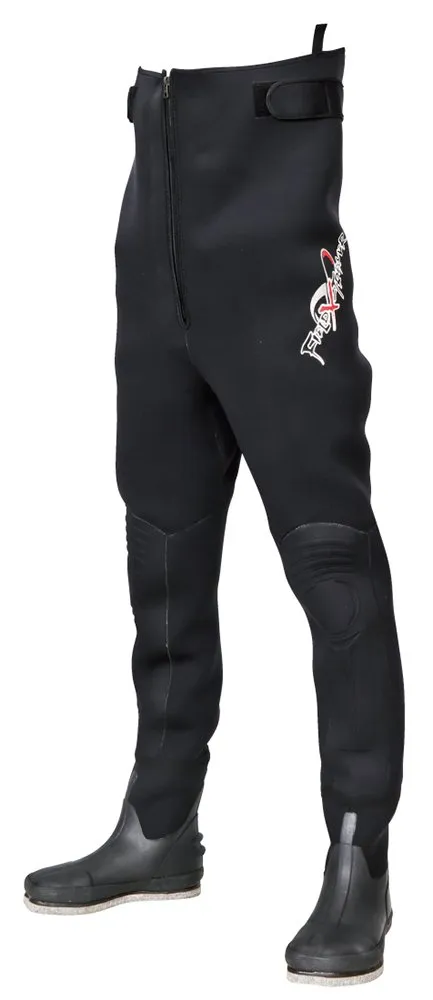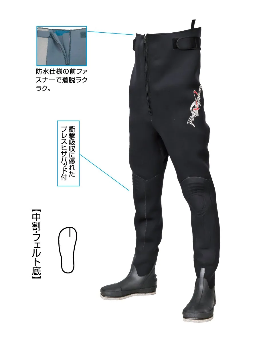 CRスポンジ+両面ジャージ(4mm厚)防水仕様の前ファスナーで着脱ラクラク。衝撃吸収力に優れたプレスヒザパット付き。 干しやすいハンガーループ 脱ぎやすいキックオフ 調節可能なチェストベルト