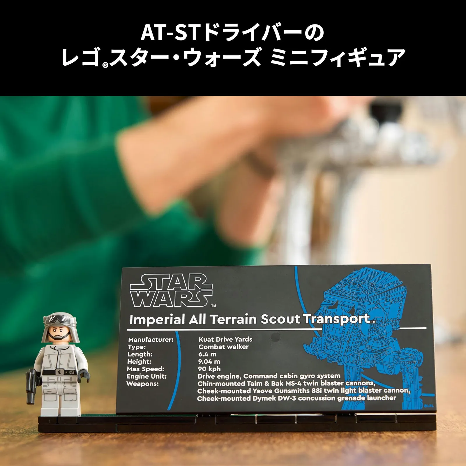 ディスプレイモデル ? 帝国軍の腕章を付け、ブラスターピストルを装備した「AT-STパイロット」のミニフィギュアや情報プレートと並べて飾ろう