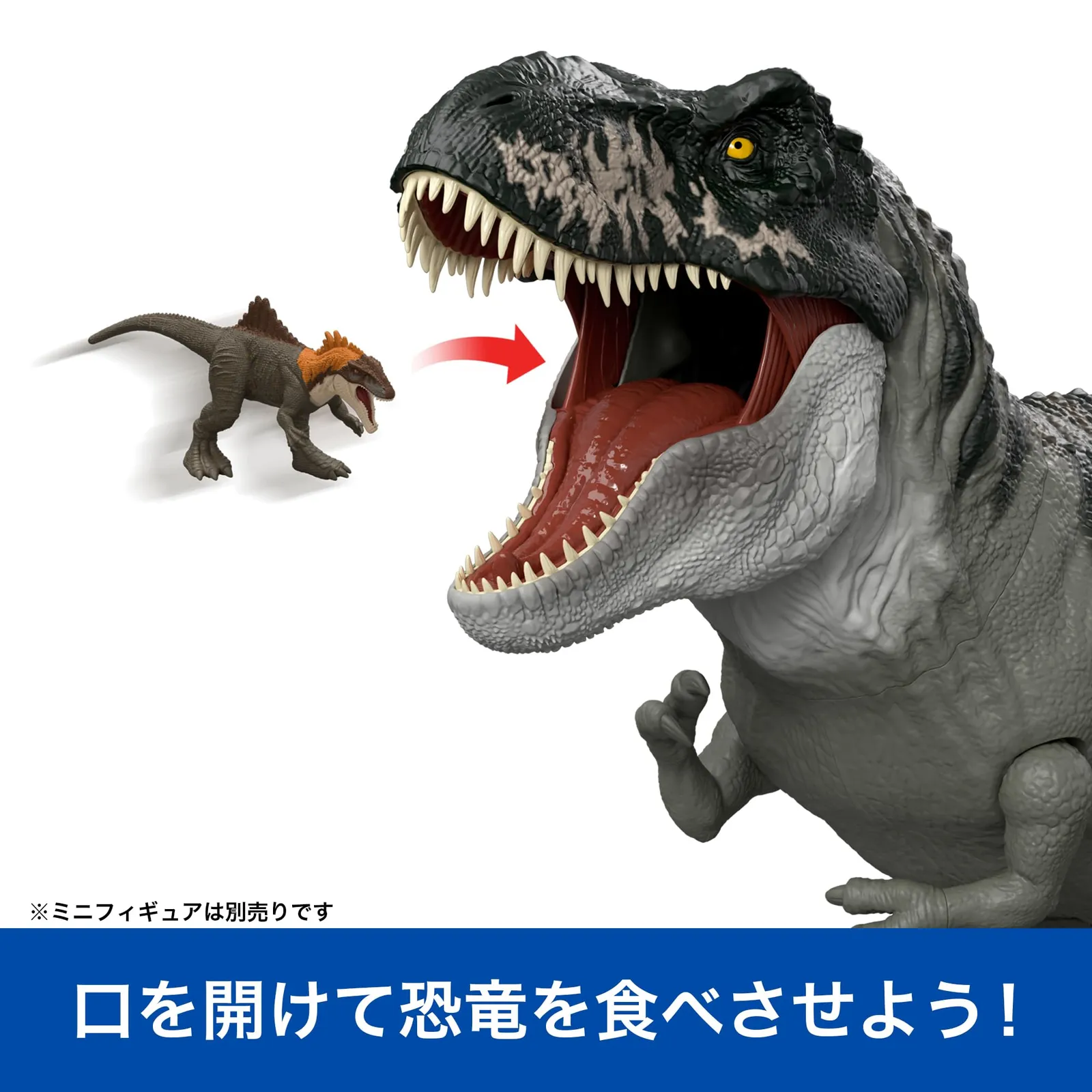 口を開けて別売りのミニフィギュアを食べさせよう!おなかを開けると出てくるよ!
