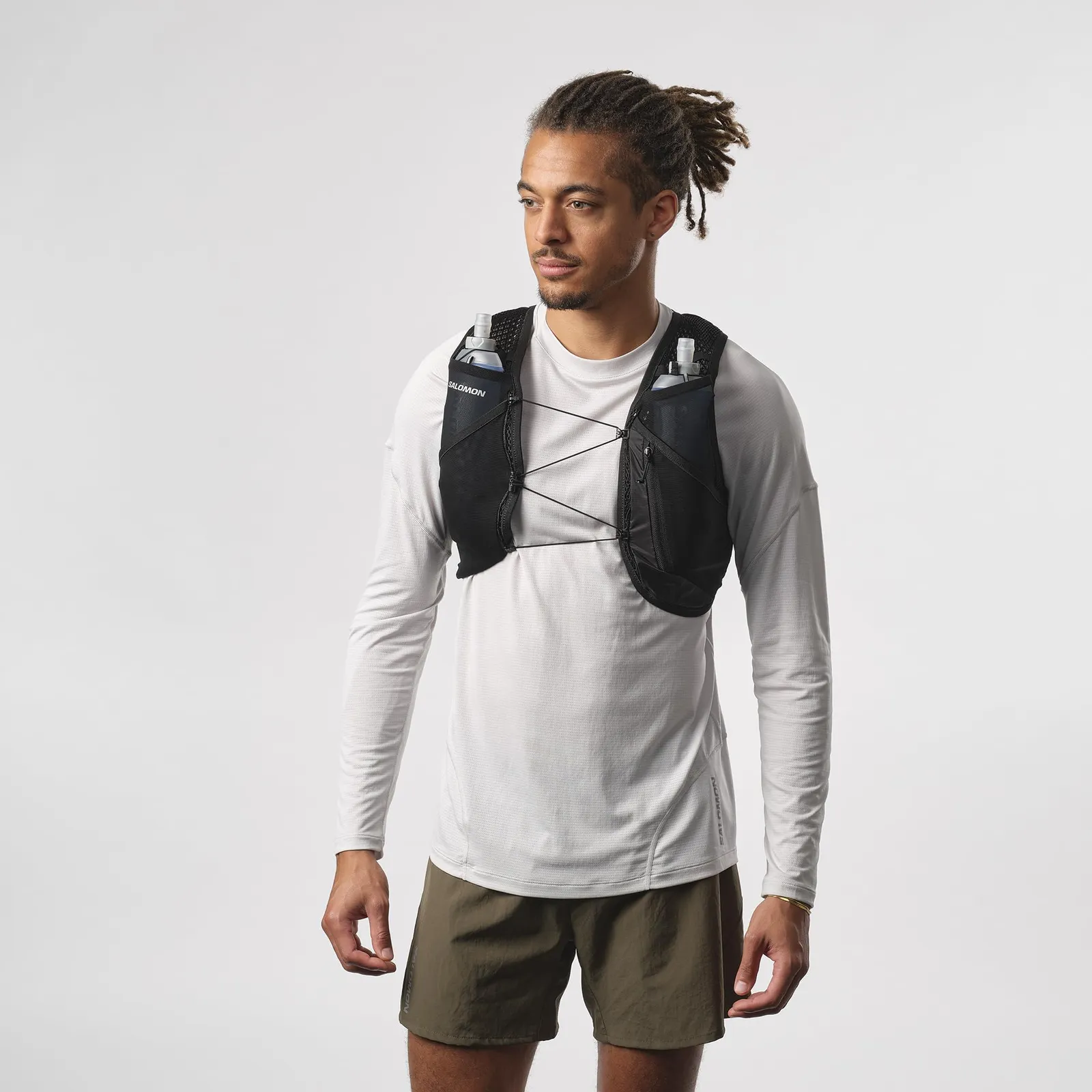 【水分補給が簡単】 2つの胸ポケットには500mlのSalomonフラスクを収納できるため、喉が渇いたらサッと取り出して水分補給。1.5リットルのハイドレーションブラッダーにも対応しています。