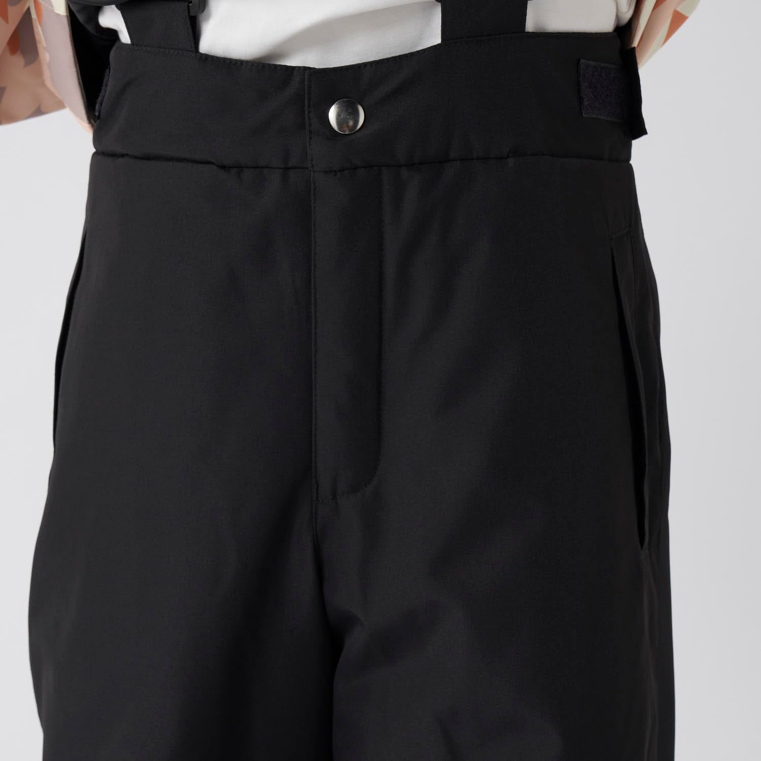 ボトムスは成長に合わせて調節が可能。サスペンダーとマジックテープで腰の位置を調節でき、内側の調節紐を引っ張ると股下を約10cm短くすることができます。