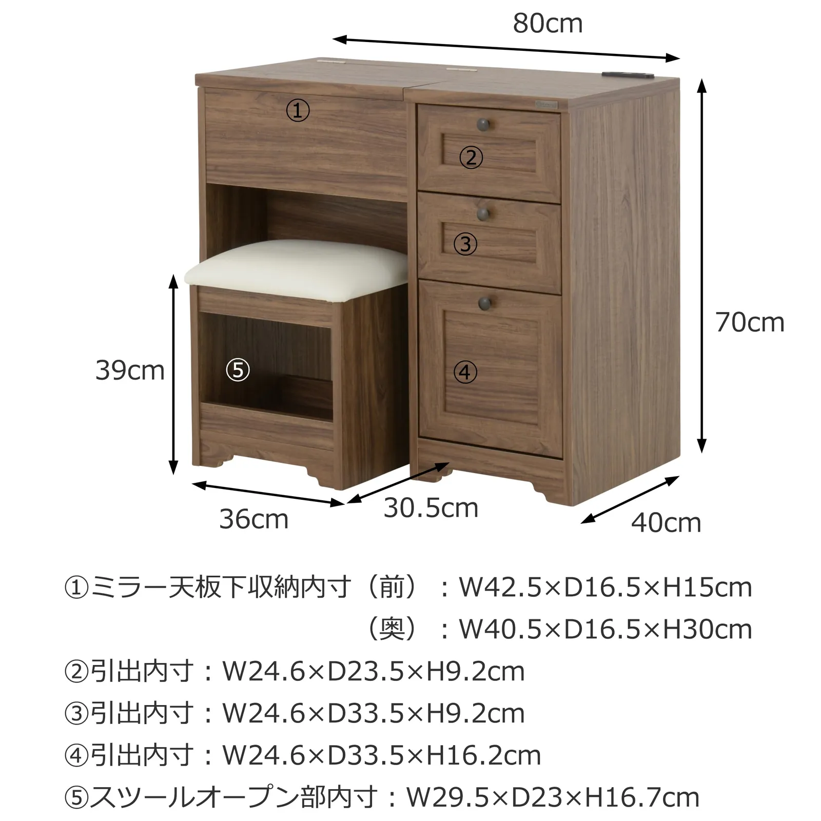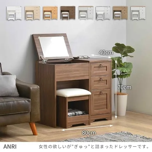 【サイズ】ドレッサー本体:幅80cm 奥行40cm 高さ70cm スツール:幅36cm 奥行30.5cm 高さ39cm