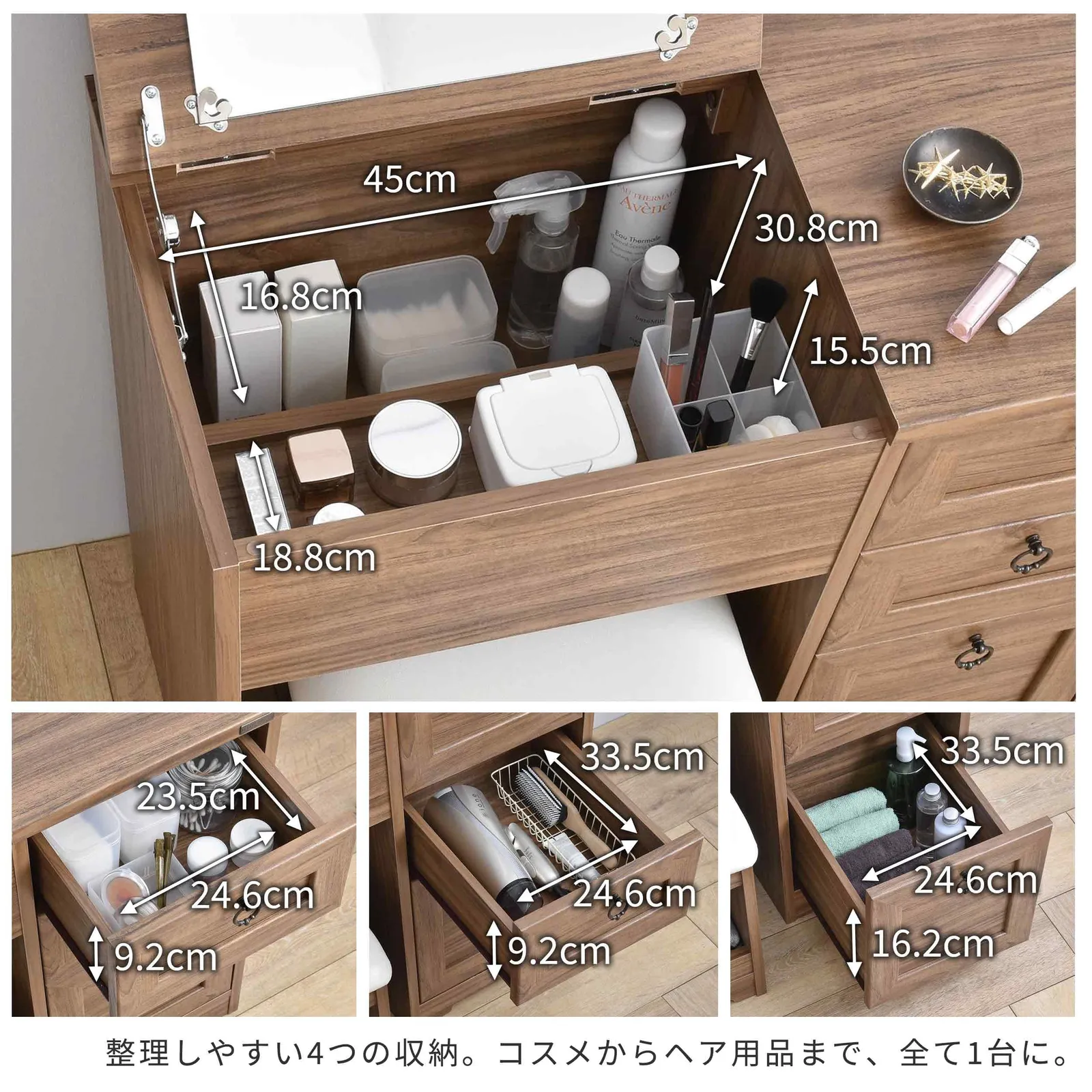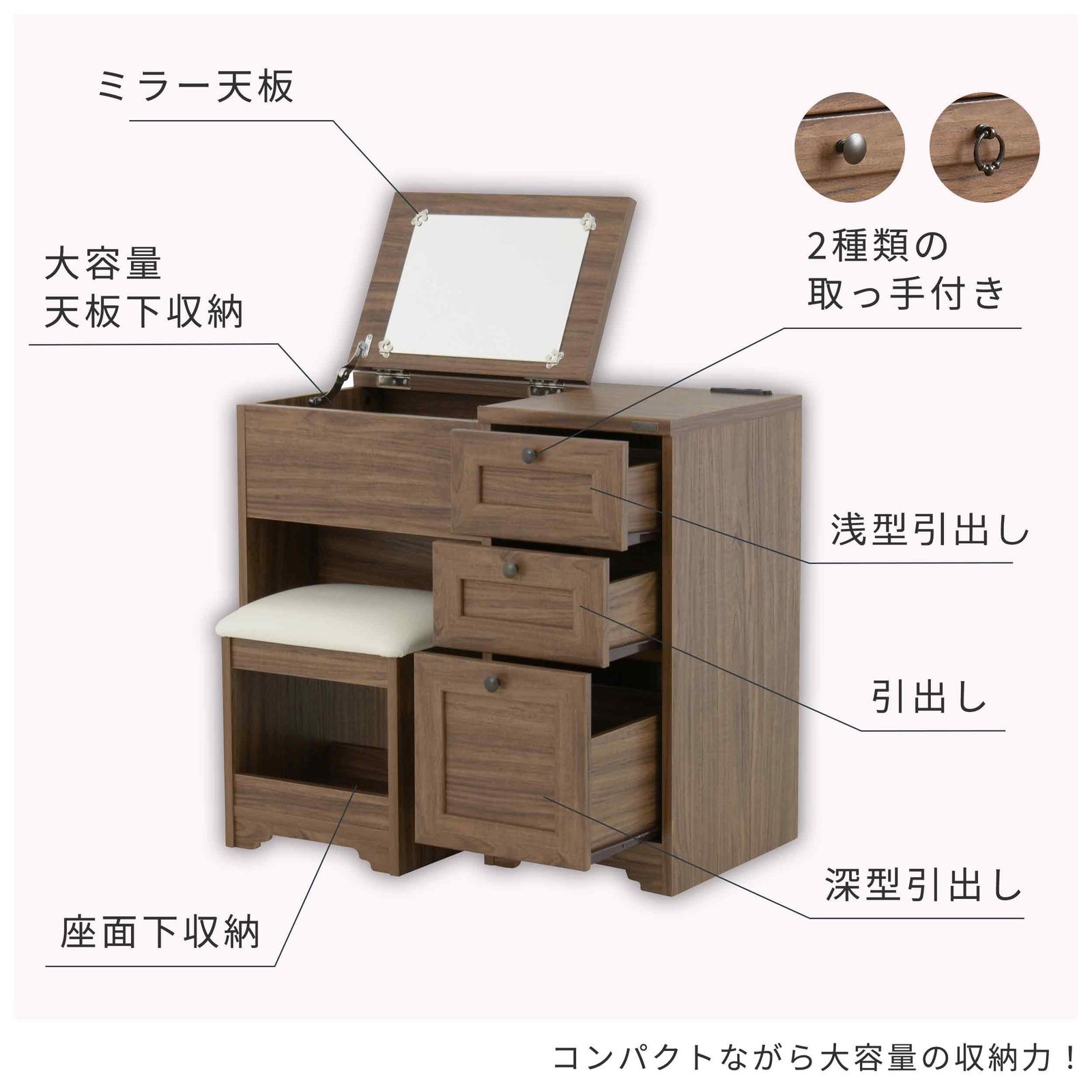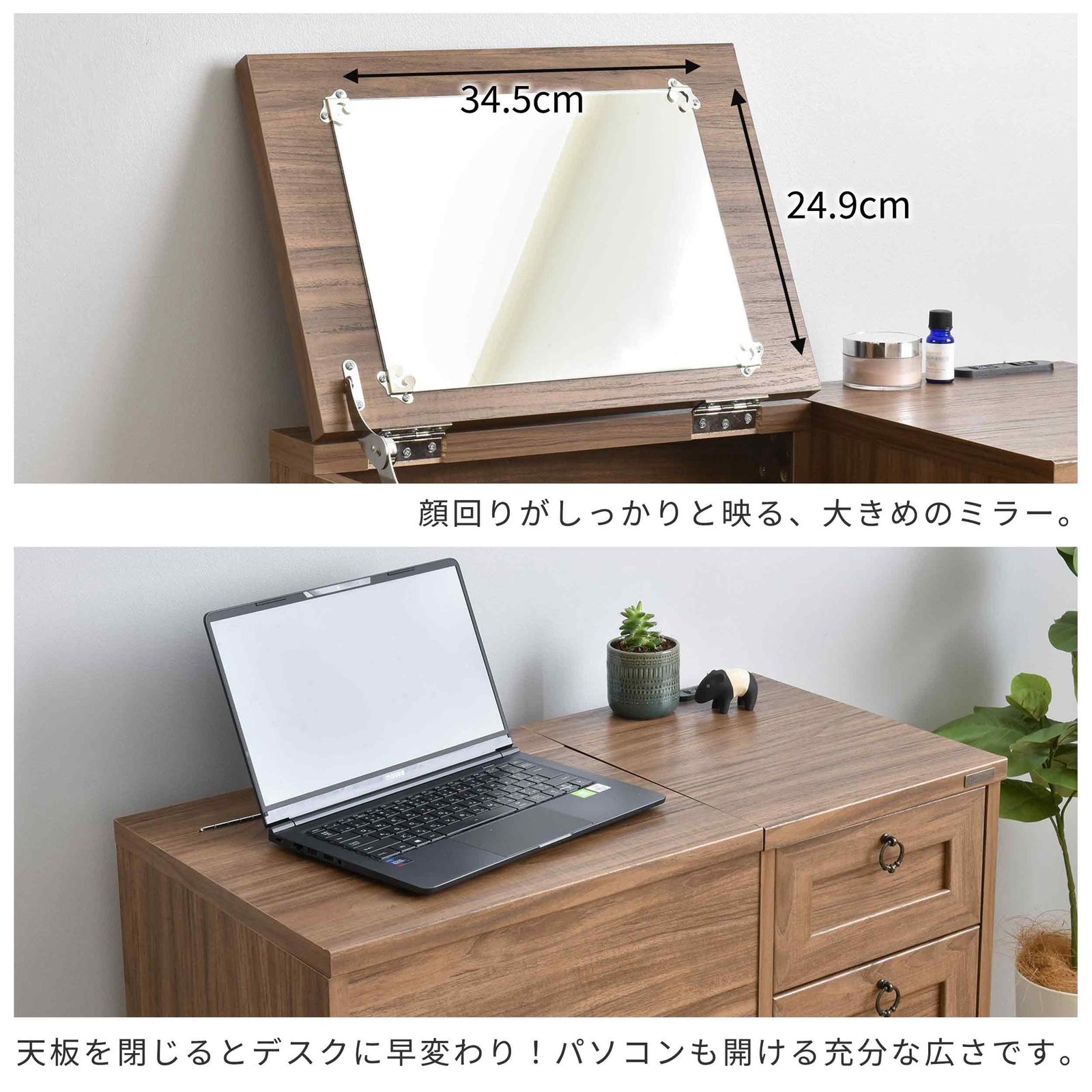 ●天板を閉じるだけでデスクになる、1台で2役こなす、便利なドレッサーです。