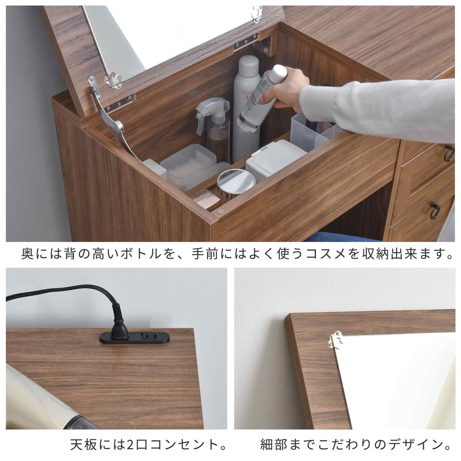 ●天板には2口コンセント付き。メイクから普段のお手入れまで全て出来ます。