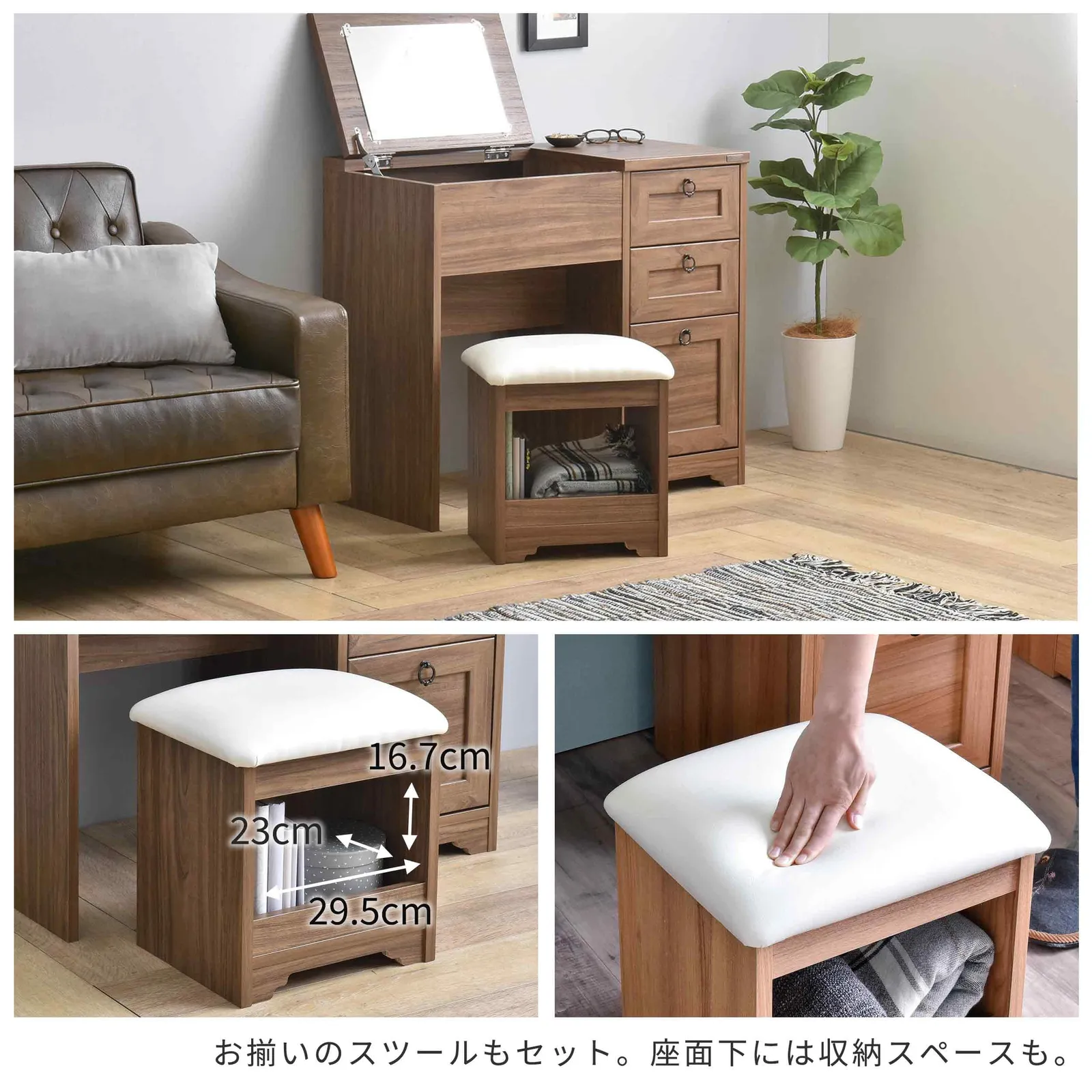 【材質】(ドレッサー)プリント紙化粧繊維板 (スツール)本体:プリント紙化粧繊維板 座面:PVC=合成皮革 ウレタンフォーム