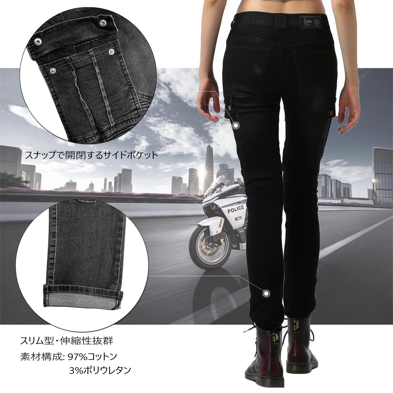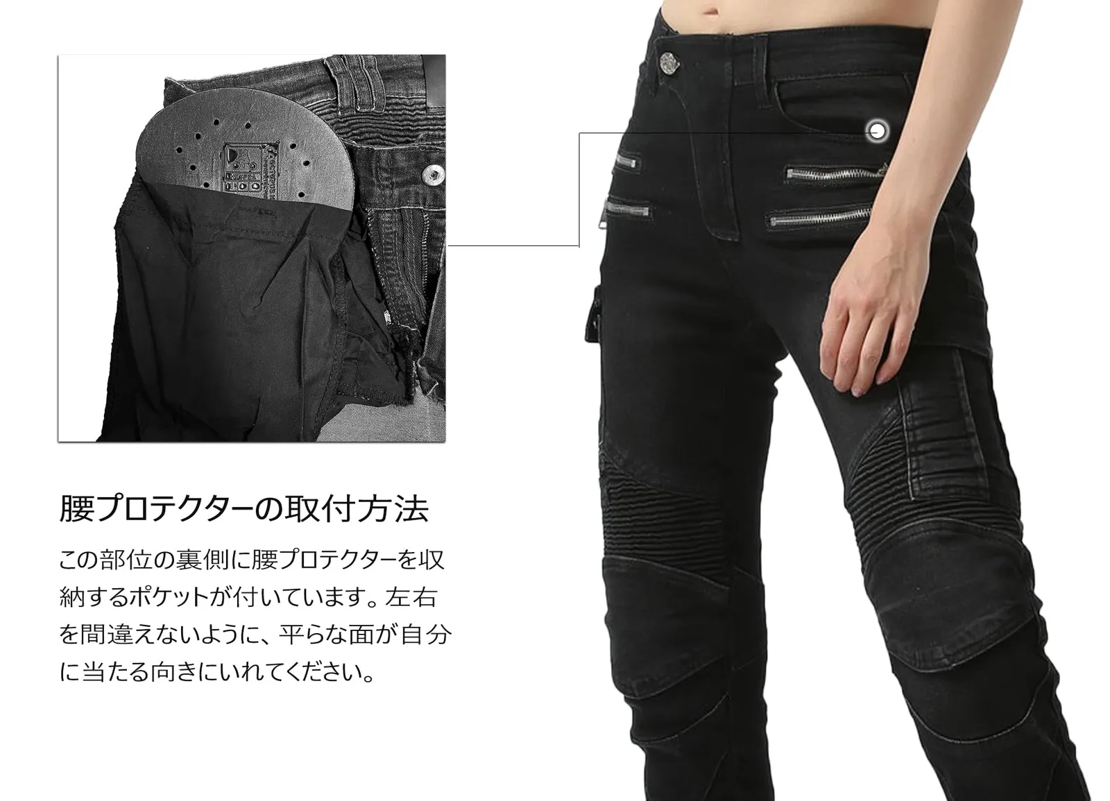 【プロテクター装備】腰、膝に保護するプロテクター装備が簡単に取付、簡単に取りはずし、人体工学の設計により高い快適性と保護性能を備えています。プロテクターを取り外せば、普通のデニムパンツとしても着用できます。