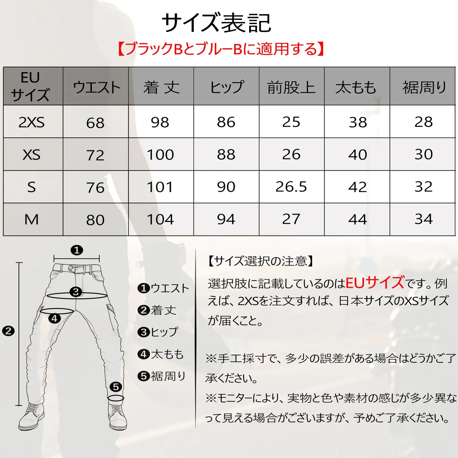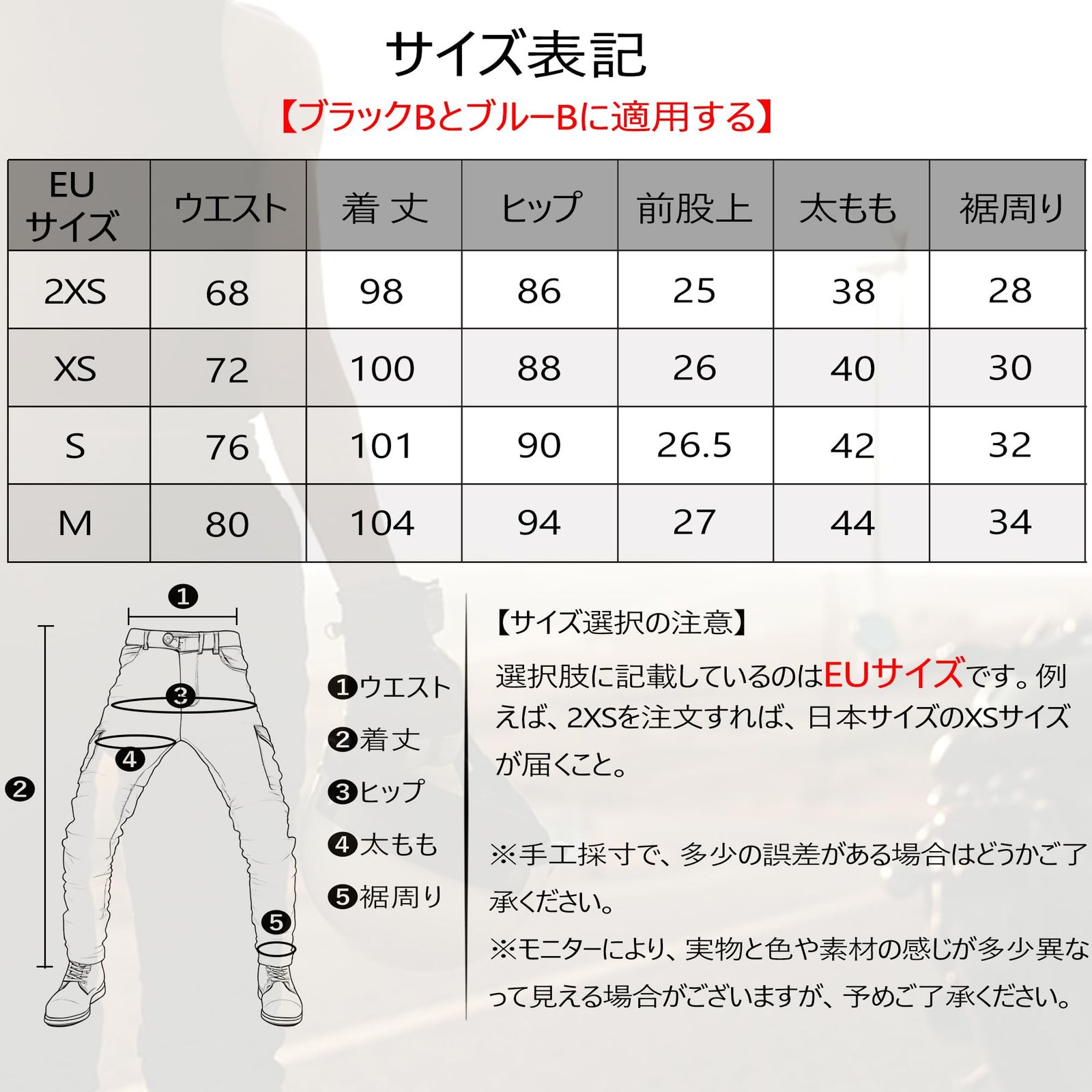 【洗濯注意】※こライダースパンツはインディゴ染め製品です。特性上、水分や汗、摩擦などにより色落ちする恐れがあります。 他の服と一緒に洗わないでください。 ※漂白剤や蛍光増白剤を使用しないでください。 長い時間水に漬けないでください。タンブラー乾燥はしないでください。