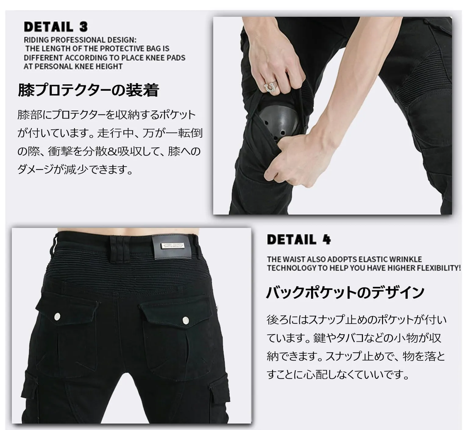 【保温防寒】生地はしっかりして、厚みがしっかりあり、適度なストレッチで良いです。厚い裏ボア付きで、とても暖かいバイクパンツです。抜群な防寒性を備え、真冬の日にもこの一本で十分です。