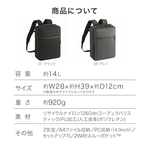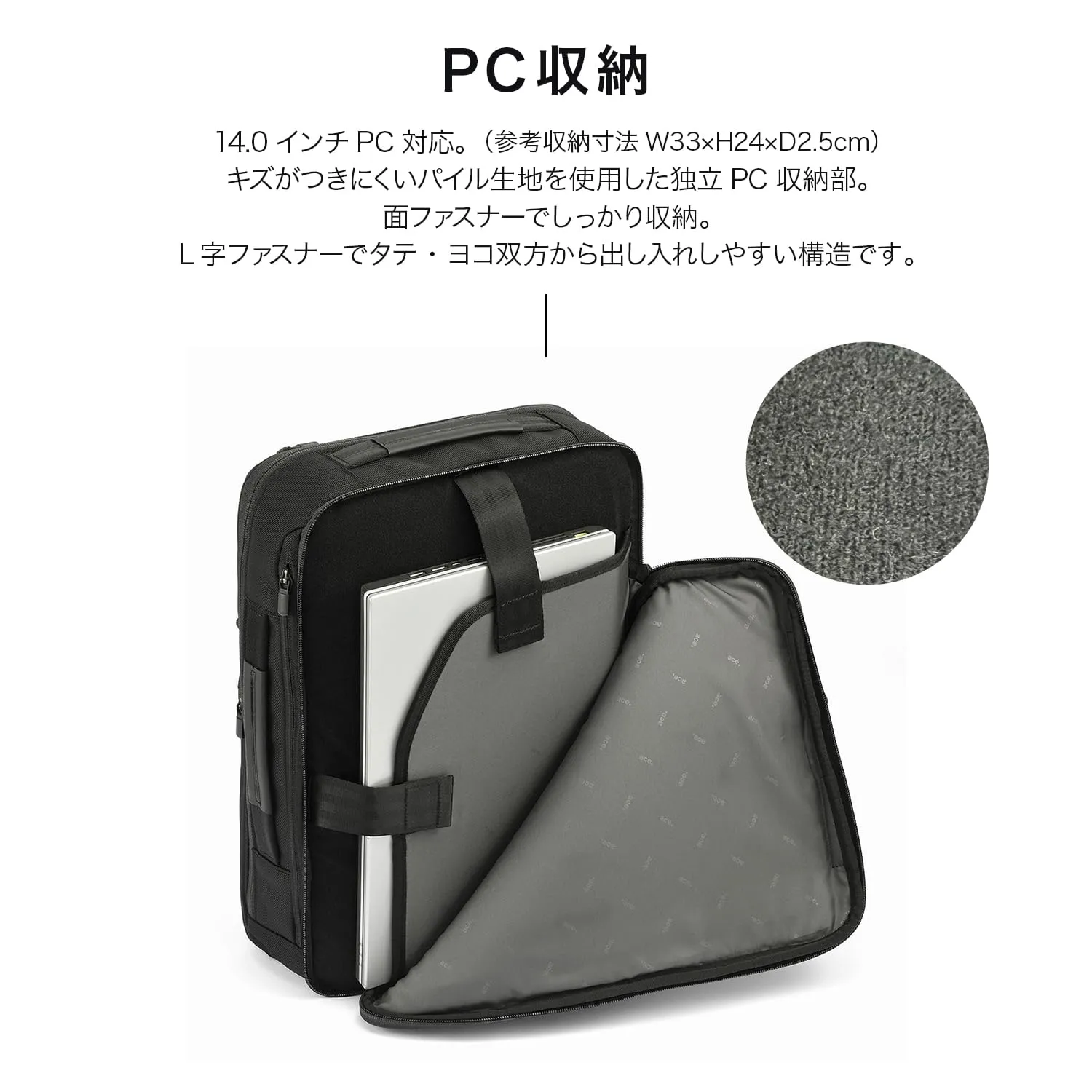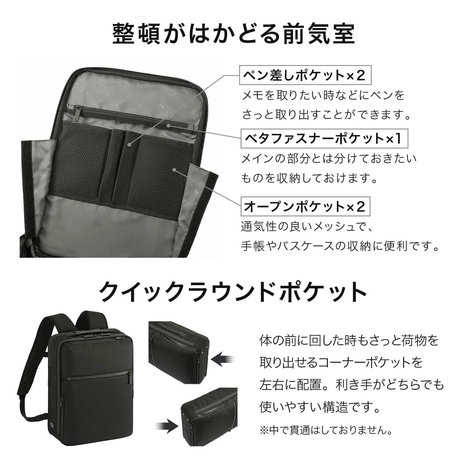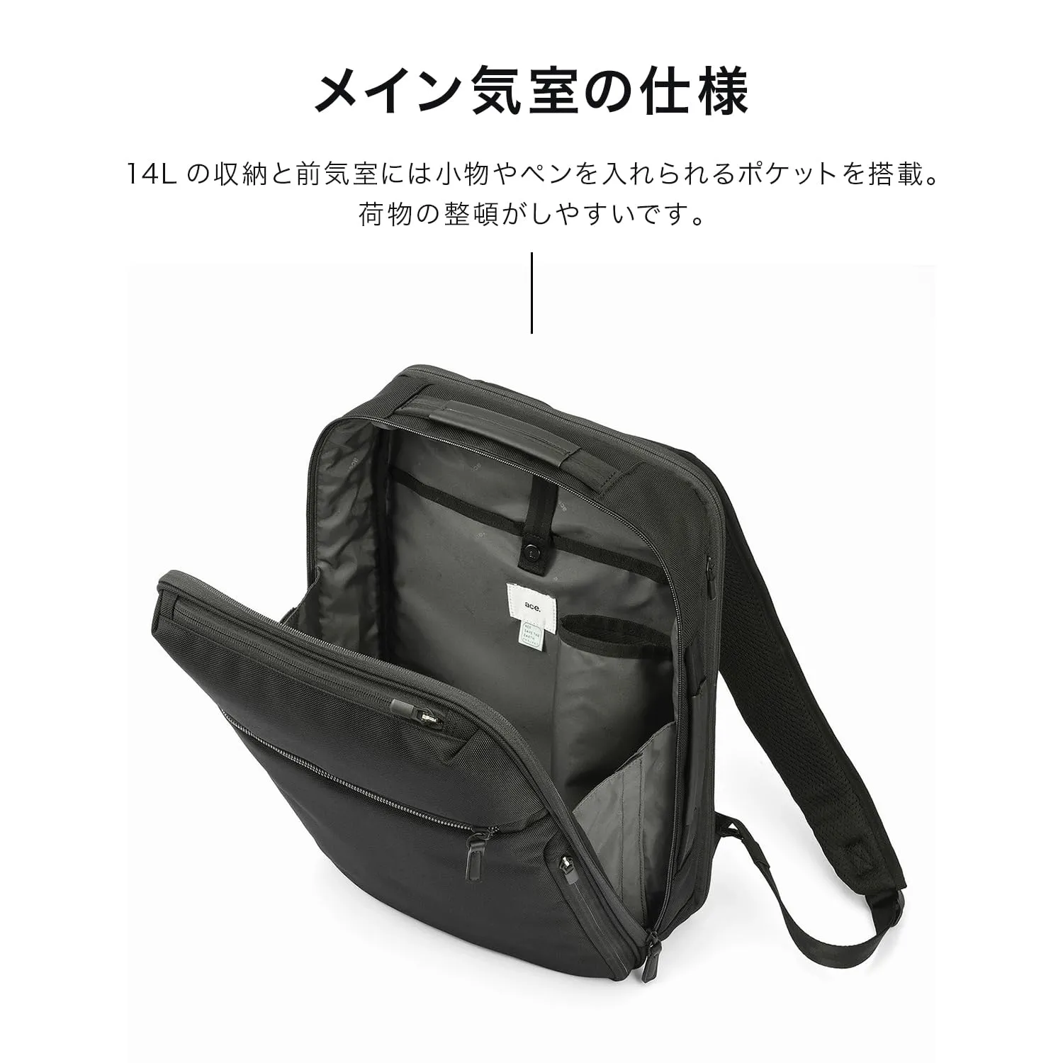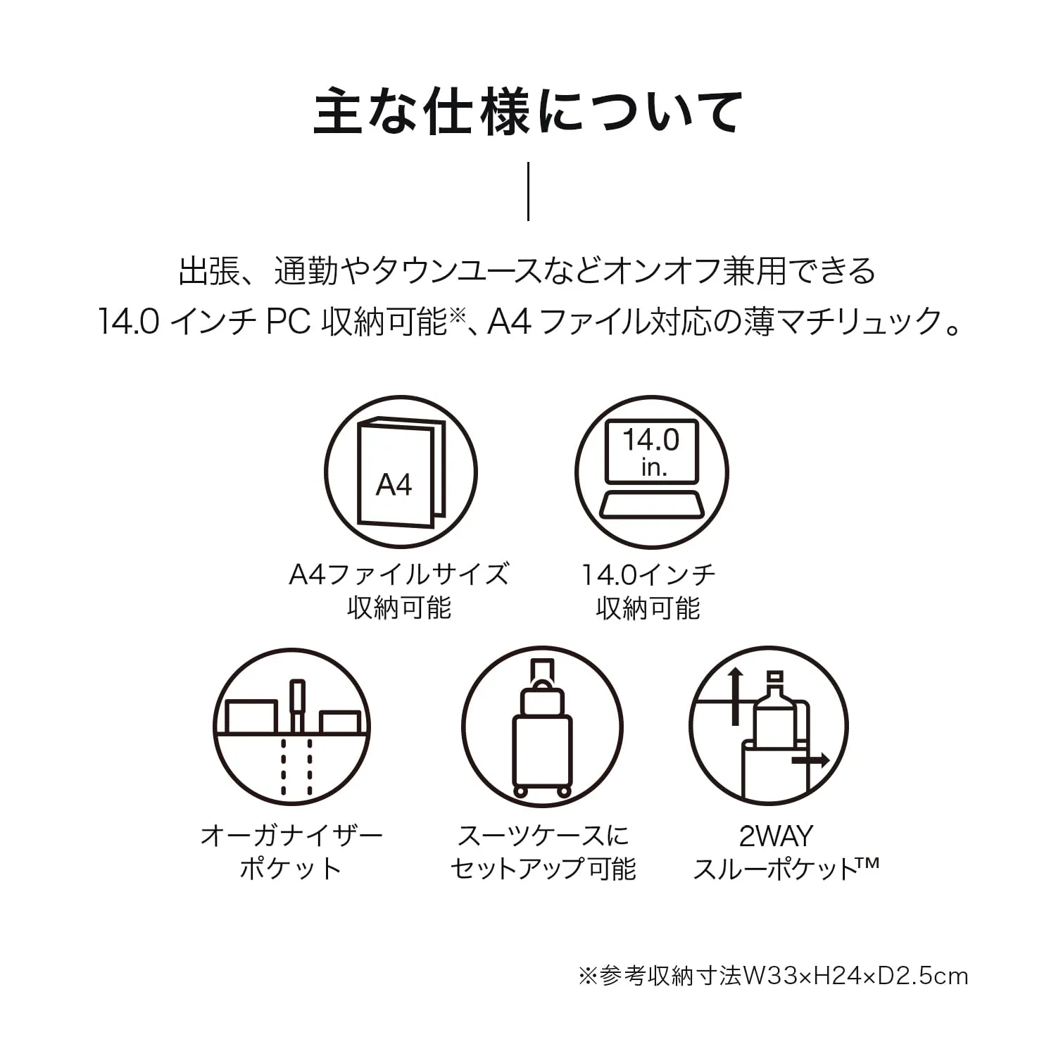 出張、通勤やタウンユースなどオンオフ兼用できる14.0インチPC収納可能・A4ファイル対応の薄マチリュック。
