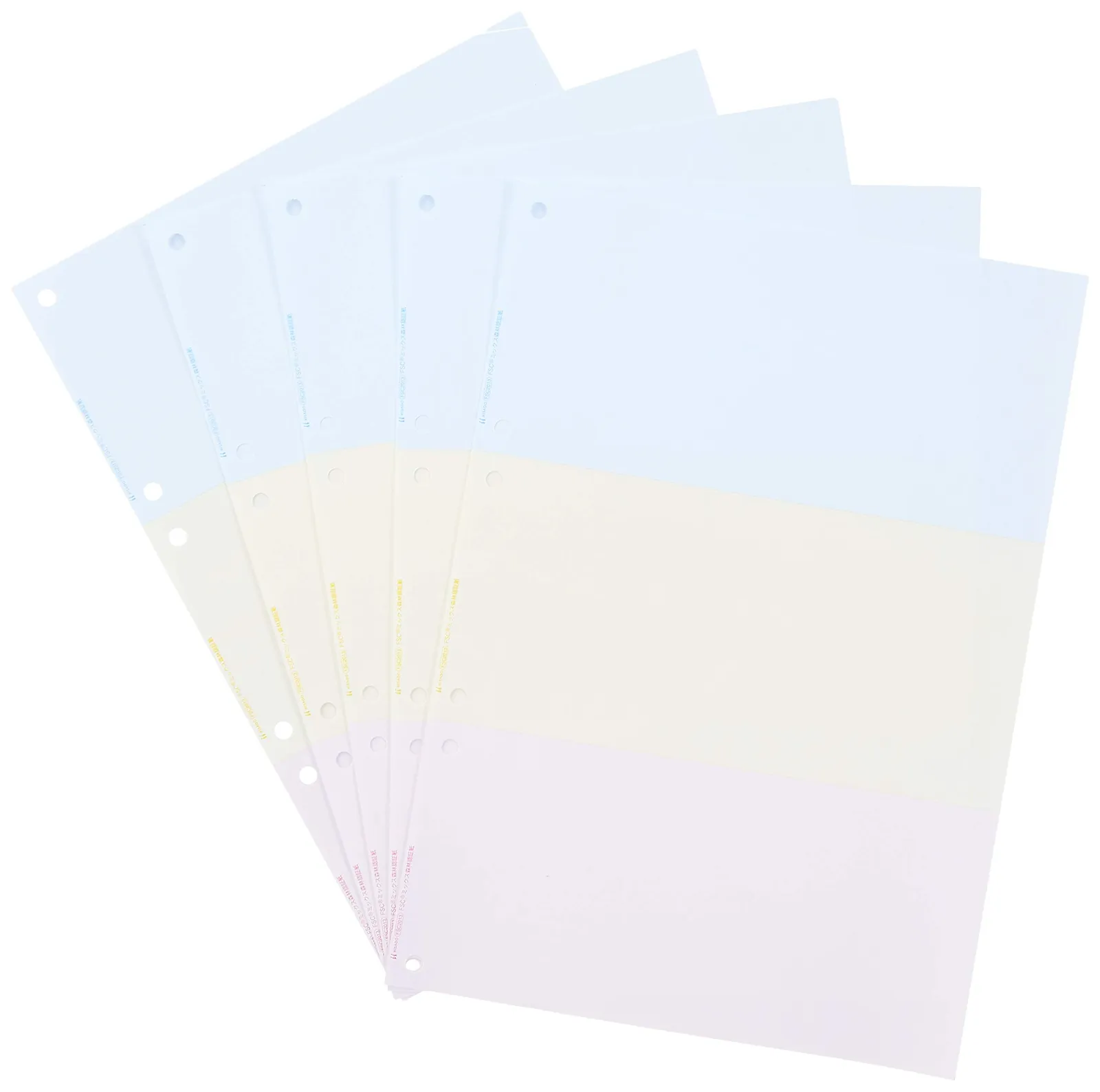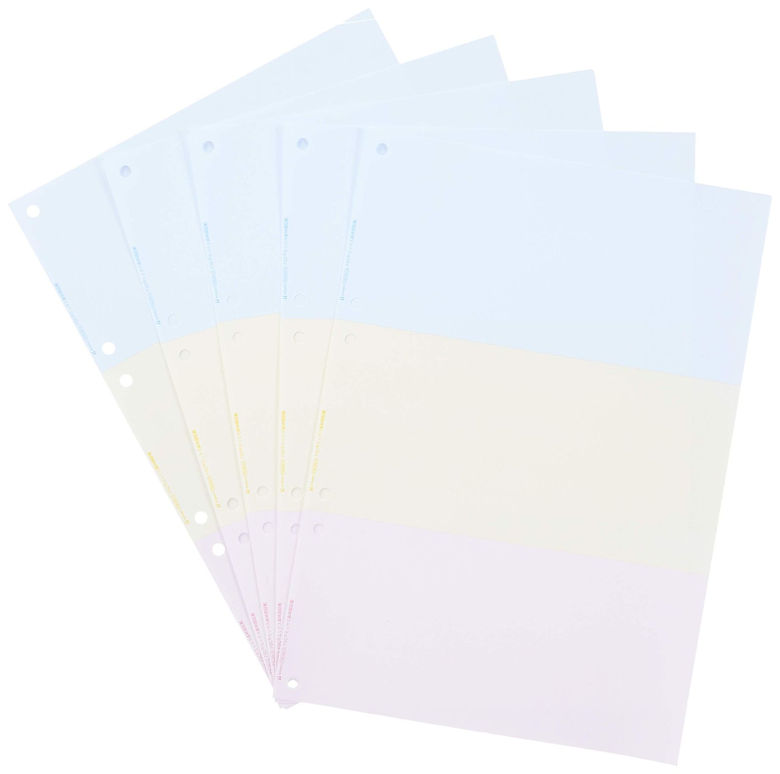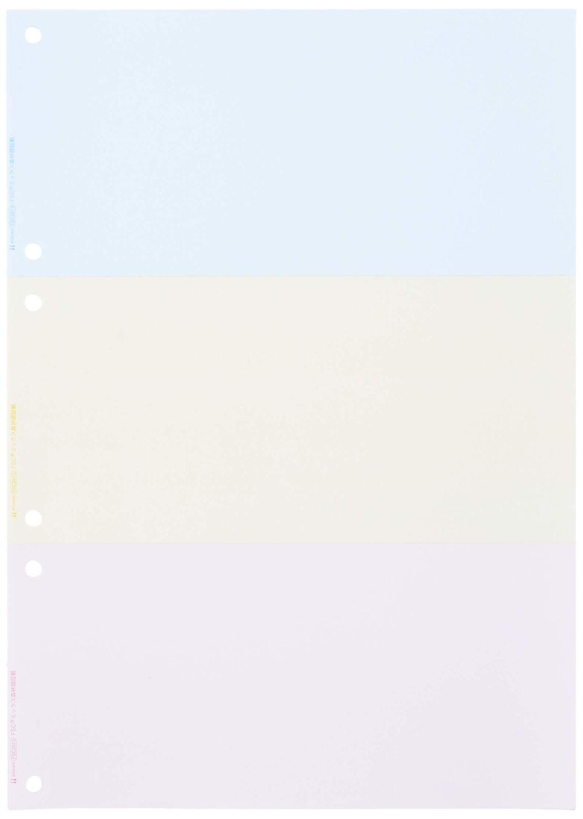 A4カラー3面(ブルー・クリーム・ピンク)。ファイル穴:2穴。ファイル穴間隔:80mm。ミシン目切り離し後のサイズ:ヨコ210xタテ99mm。紙厚:0.08mm。クリアカットミシンでキレイに切り離せます。納品書などの伝票や、社内帳票の印刷に便利。FSCミックス認証紙使用。