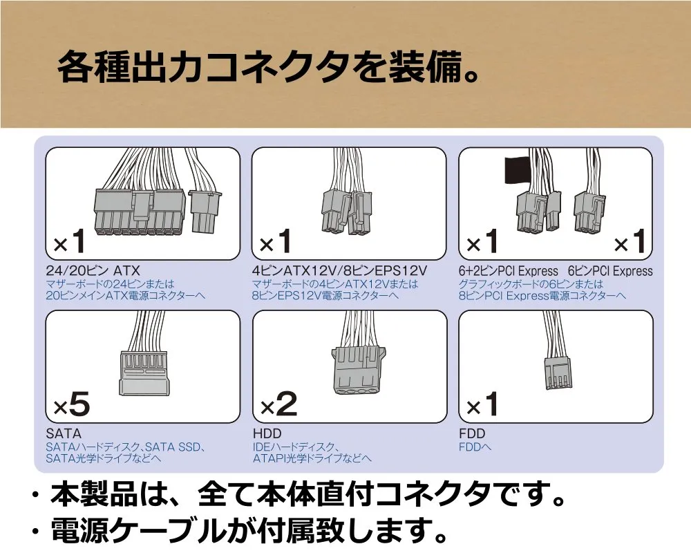 【直付コネクタ】24pin ATX x1(40cm)/4+4pin ATX/EPS 12V x1(40cm)/6+2pin-6pin PCI-E x1(40-15cm)/SATA x5, HDD x2,FDD x1