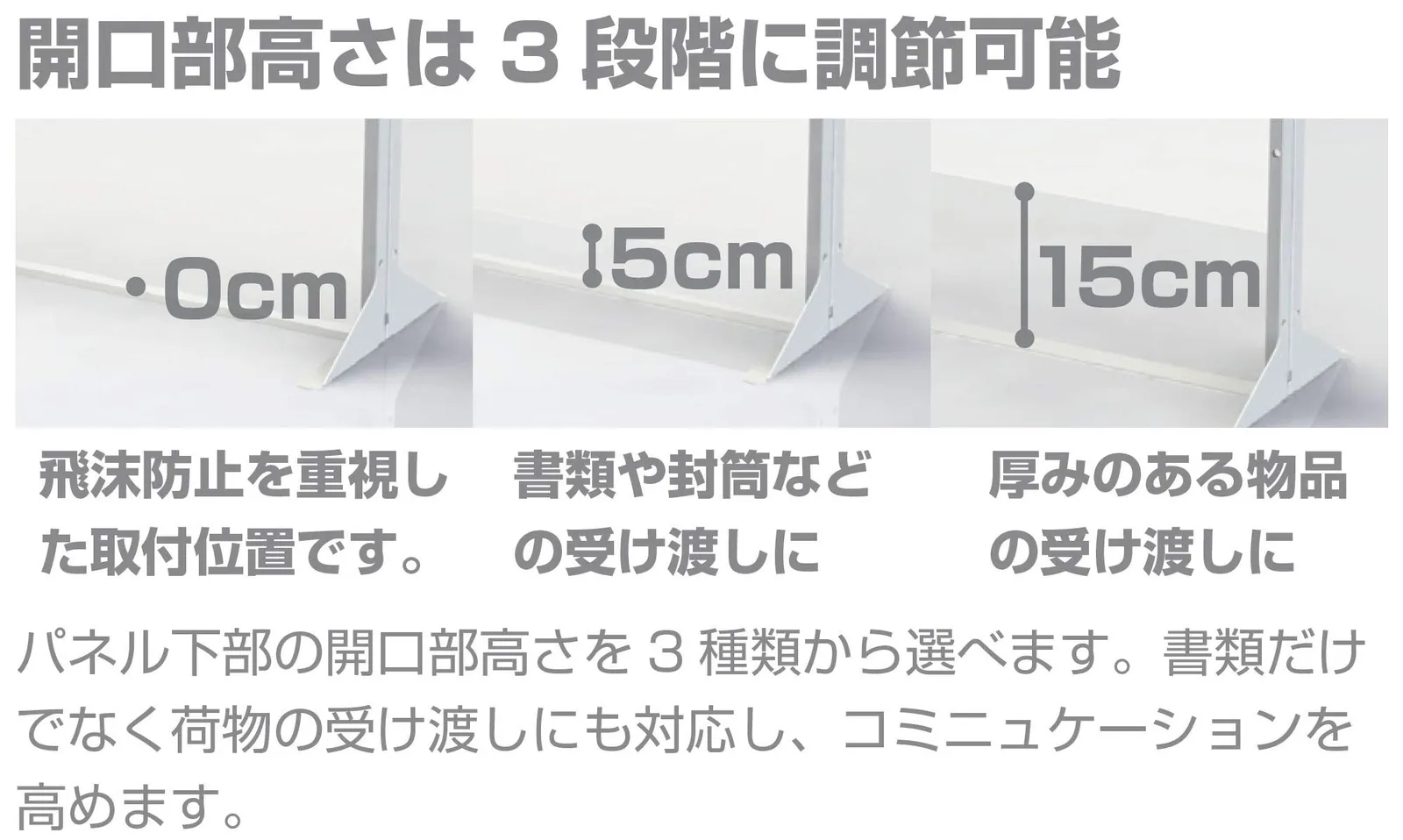 パネル下部の開口部高さを3 種類から選べます。書類だけでなく荷物の受け渡しにも対応し、コミニュケーションを高めます。