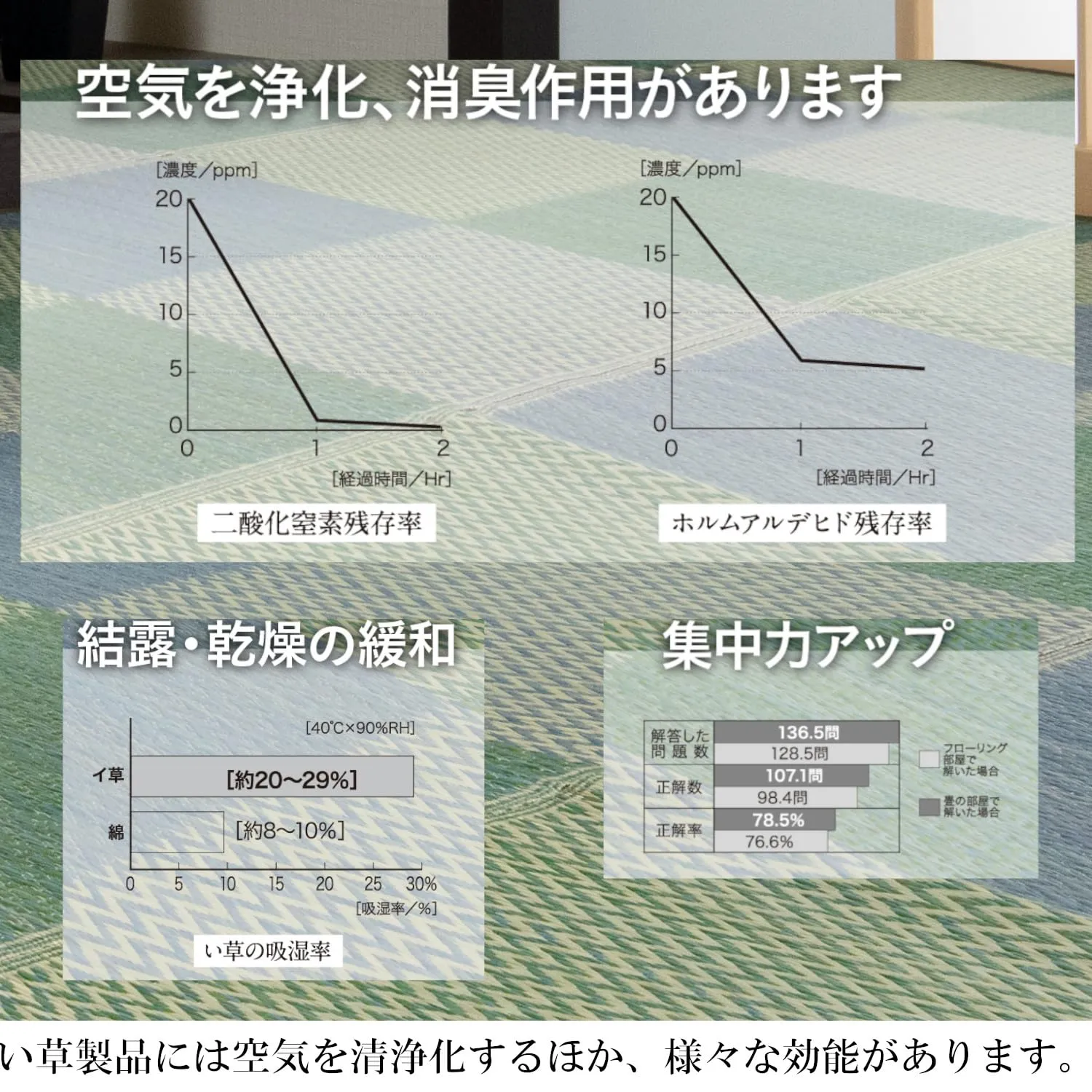 【清潔な空間を】い草には空気の清浄作用、湿度の調整作用があり、汚れにくいといった特徴があります。敷くだけで畳のお部屋をリフレッシュできます。